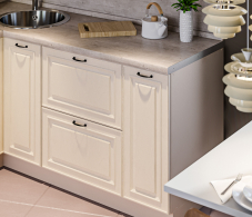 Рамочные филенчатые фасады из МДФ: Каждый фасад выполнен из высококачественного МДФ с рамочной конструкцией и филенками, что придает кухне характерный классический вид. Эти фасады не только красивы, но и устойчивы к механическим повреждениям и воздействию влаги.
