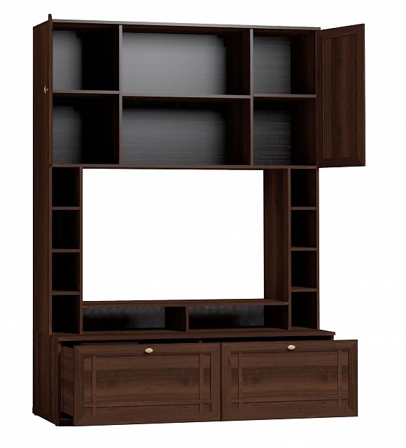 Модуль 1 из коллекцииSherlock поможет Вам обустроить гостиную в классическом стиле. Строгий корпус мебели из ЛДСП гармонично дополнен рамочными фасадами из МДФ и стильной миниатюрной фурнитурой. Компактные размеры модели позволят расположить ее даже в небольшой по площади гостиной и грамотно обыграть ТВ-зону. Ниша высотой 73 см и шириной 115 см вмещает телевизор диагональю до 44". Боковые открытые полки пригодятся для хранения различных мелочей и предметов декора. Два выдвижных ящика оснащены шариковыми направляющими и отличаются увеличенной глубиной, а значит всем Вашим вещам хватит места. Максимальная нагрузка на один ящик - 20 кг.