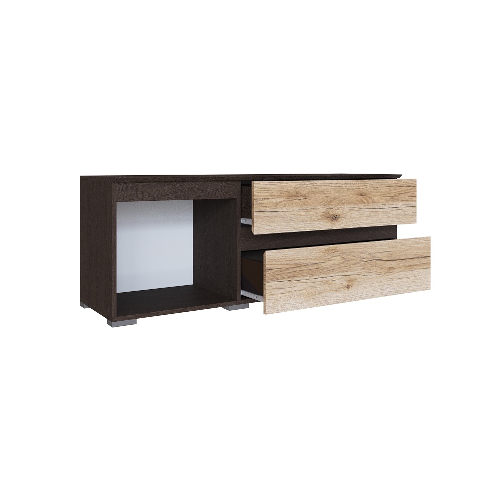 Компактная ТВ-тумба для гостиной с современным интерьером. Имеет закрытую створкой нишу и два выдвижных ящика. Лицевая фурнитура отсутствует: фасады открываются за скос.