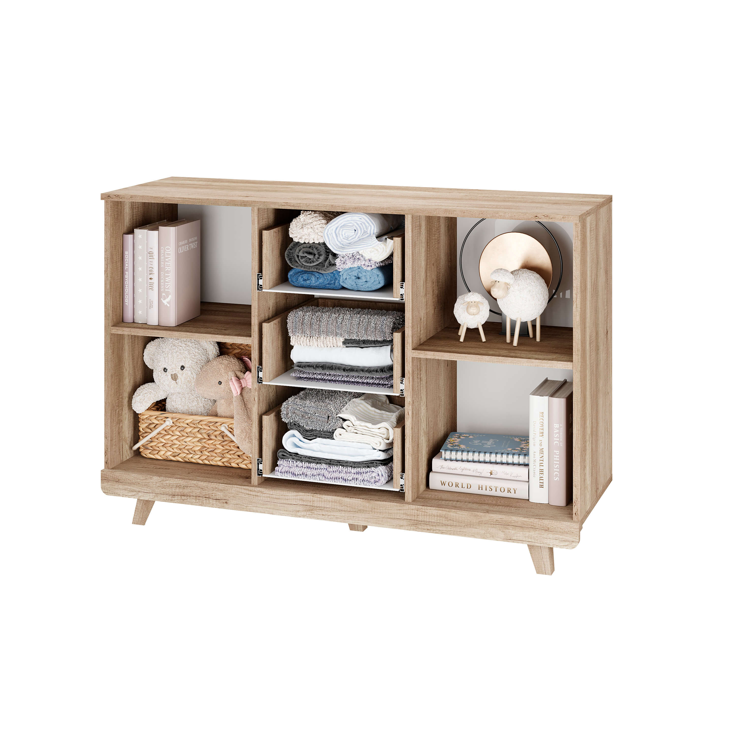 Отличительная черта комодов серии Мегаполис – сочетание теплого оттенка дерева и фотопечати с трендовым рисунком. На таких поверхностях не видно пыли и грязи, что является огромным плюсом для домохозяек. Комод состоит из двух распашных по бокам и трёх выдвижных по центру вместительных ящиков. Полезное пространство распашных ящиков разделено полками.