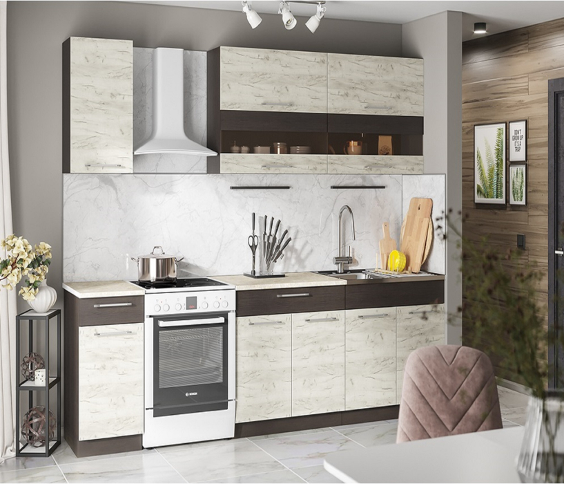 Гарнитур Маша шириной 2.0 м спроектирована для тех хозяек, которые мечтают готовить на удобной и стильной кухне. Верхние модули: ШВ 800, ШВ 800, ШВ 400 - (ВхГ) 71.5х30 см. Нижние модули: ШНМ 800, ШН1Я 800, ШН1Я 400 - (ВхГ) 84.5х52 см (высота указана с учётом столешницы)