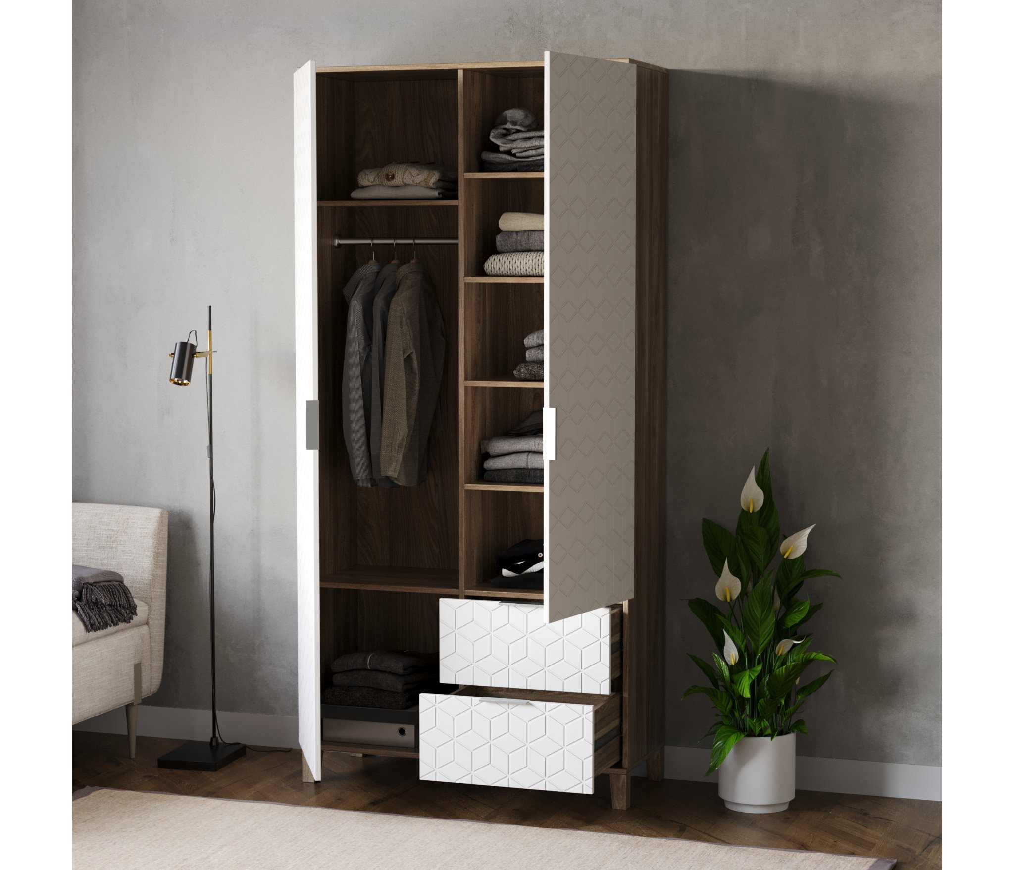 Шкафы Марвин, выполненные в скандинавском стиле, органично дополнят интерьер любой комнаты. Ножки из массива бука, геометрическая фрезеровка на фасадах, сочетание цветов отличительная черта серии Шкафов Марвин.