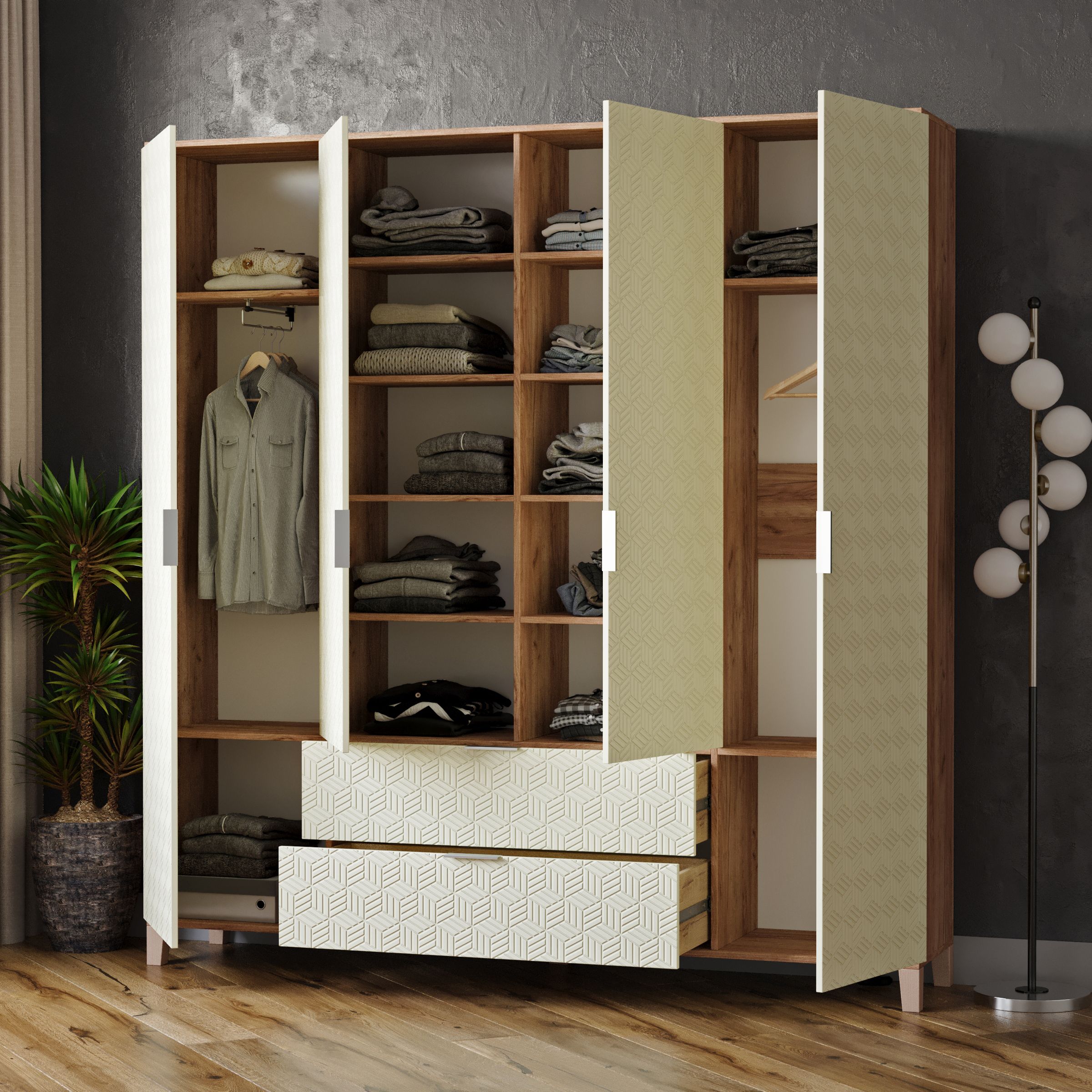 Шкафы Марвин, выполненные в скандинавском стиле, органично дополнят интерьер любой комнаты. Ножки из массива бука, геометрическая фрезеровка на фасадах, сочетание цветов отличительная черта серии Шкафов Марвин.