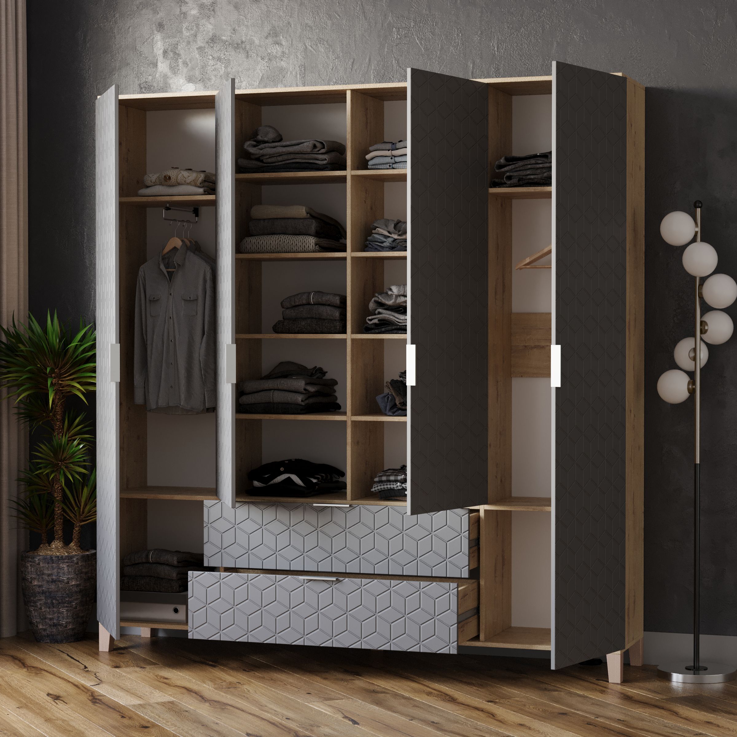 Шкафы Марвин, выполненные в скандинавском стиле, органично дополнят интерьер любой комнаты. Ножки из массива бука, геометрическая фрезеровка на фасадах, сочетание цветов отличительная черта серии Шкафов Марвин.