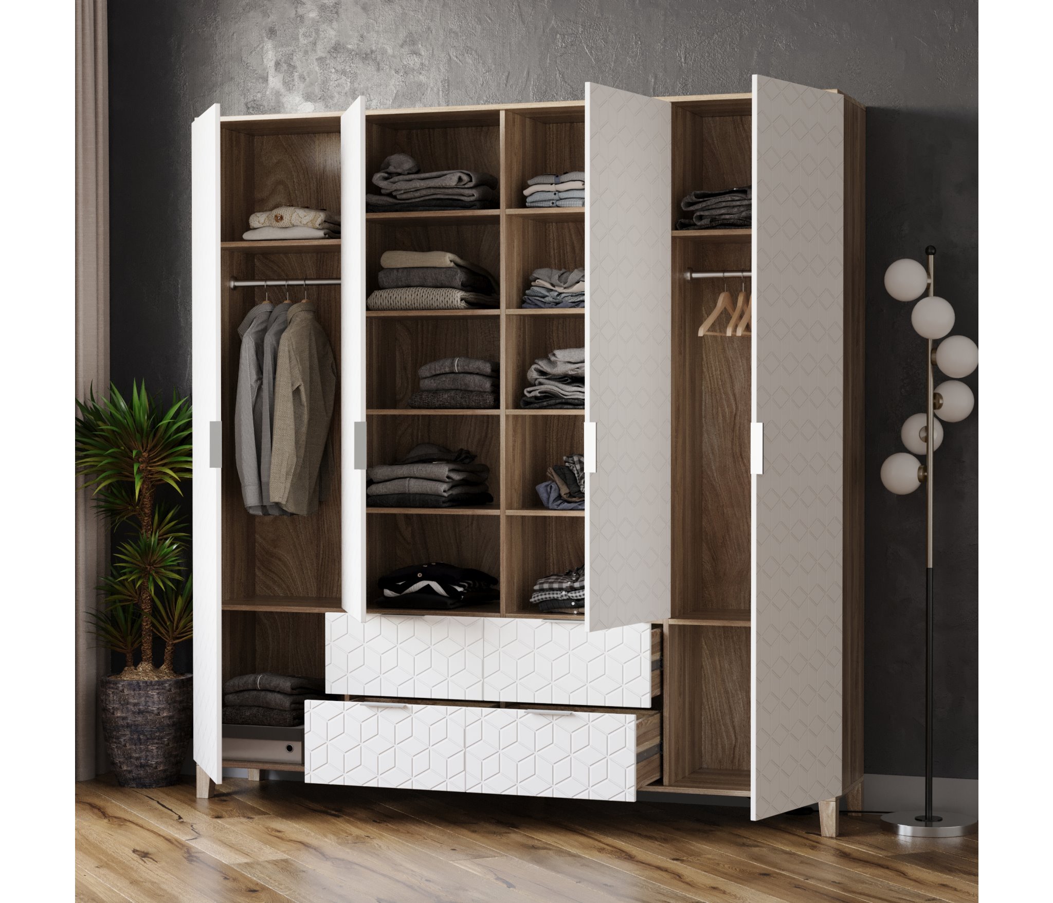 Шкафы Марвин, выполненные в скандинавском стиле, органично дополнят интерьер любой комнаты. Ножки из массива бука, геометрическая фрезеровка на фасадах, сочетание цветов отличительная черта серии Шкафов Марвин.