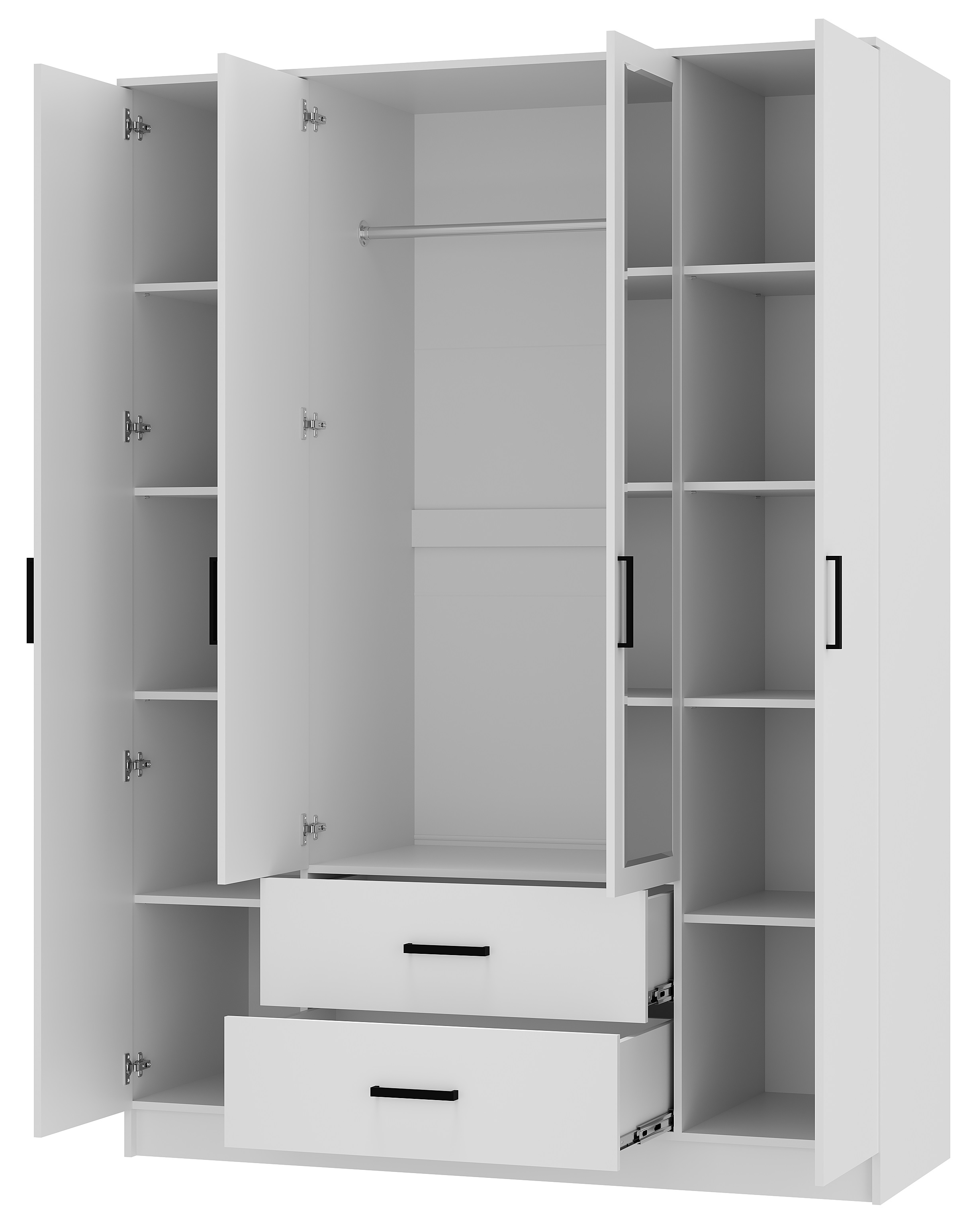 Коллекция мебели для спальни Фьюжн является воплощением эстетики минимализма. Белый цвет в сочетании с черной фурнитурой, строгие линии, простой конструктив – все это лучшие черты мебельного дизайна. Вместительный 4-х дверный шкаф - универсальное решение для организации хранения одежды в спальне или прихожей. Модуль оснащен стационарной штангой для хранения одежды на плечиках, двумя выкатными ящиками и набором полок. Зеркальный фасад визуально облегчает конструкцию шкафа и добавляет воздуха интерьеру, в котором он расположен.