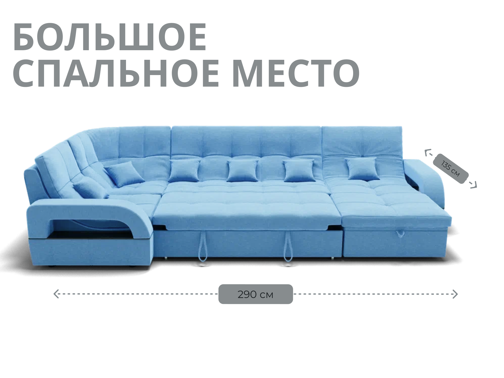 Спальное место имеет ширину 135 см и длину 290 см. Он предназначен для двух человек и имеет глубину сиденья 65 см. Максимальная нагрузка на диван составляет 280 кг.