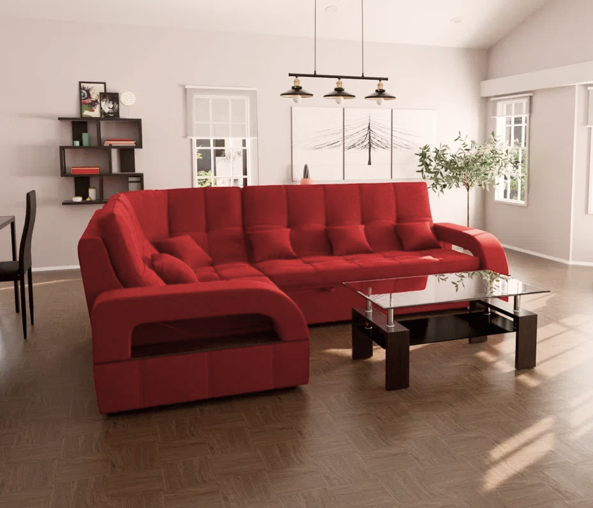 Он имеет высоту 97 см, ширину 187 см и глубину 268 см. Диван обладает универсальным расположением угла, что позволяет его использовать в любом помещении.