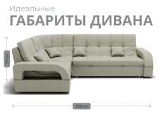 Он имеет высоту 97 см, ширину 187 см и глубину 268 см. Диван обладает универсальным расположением угла, что позволяет его использовать в любом помещении.