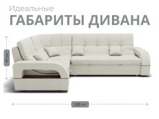 Он имеет высоту 97 см, ширину 187 см и глубину 268 см. Диван обладает универсальным расположением угла, что позволяет его использовать в любом помещении.