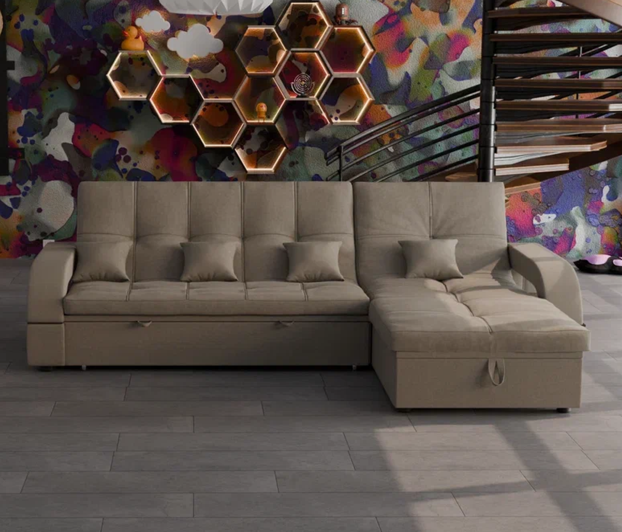 Он имеет высоту 97 см, ширину 268 см и глубину 175 см. Диван обладает универсальным расположением угла, что позволяет его использовать в любом помещении.