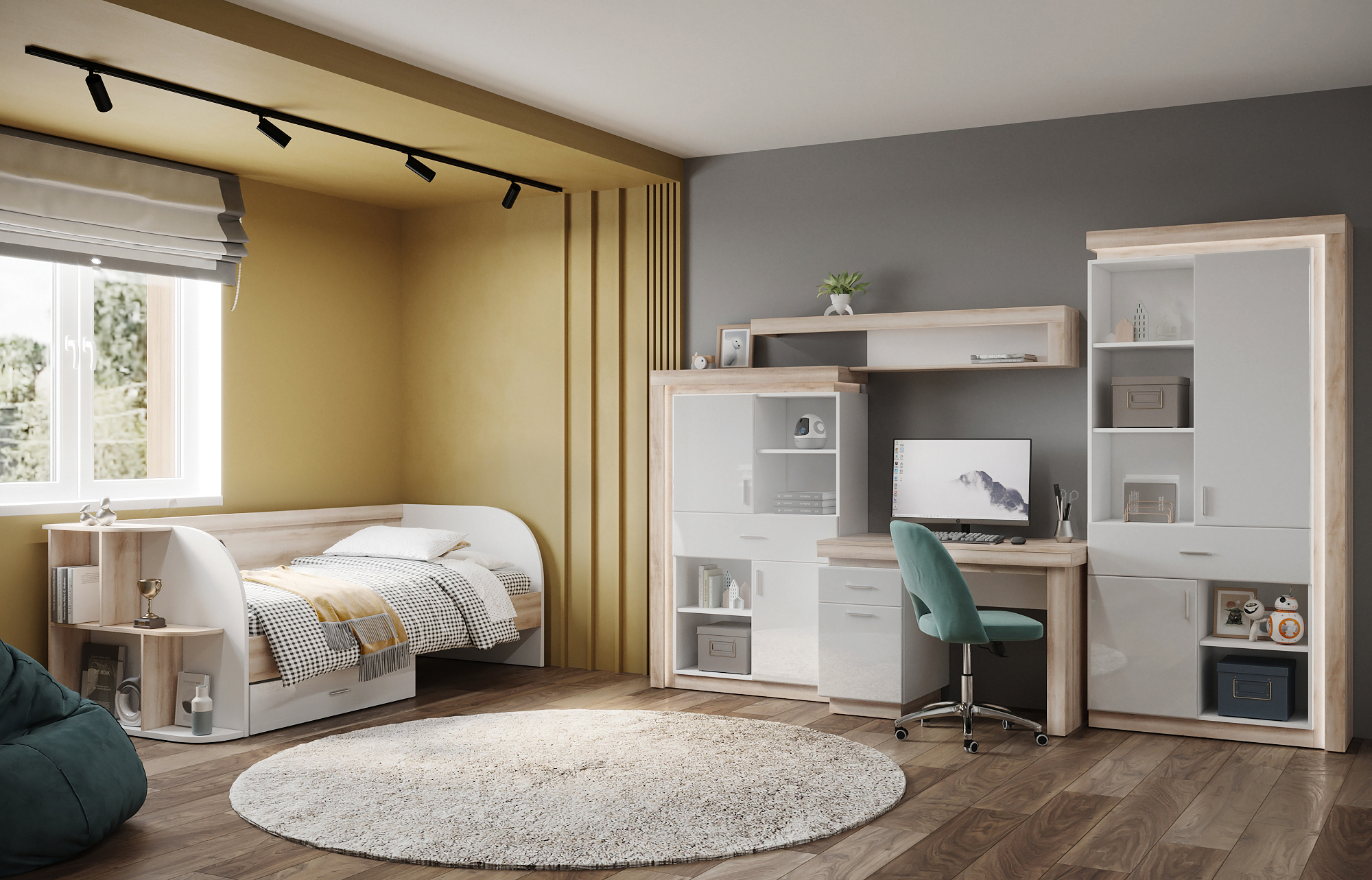 Письменный стол Люмен 21 — это универсальный и функциональный стол, который подойдёт для детской комнаты или спальни. Он оснащён выдвижным ящиком и глухой створкой, за которой скрывается полка. Стол можно использовать как рабочий стол или дополнить зеркалом и превратить в туалетный столик.