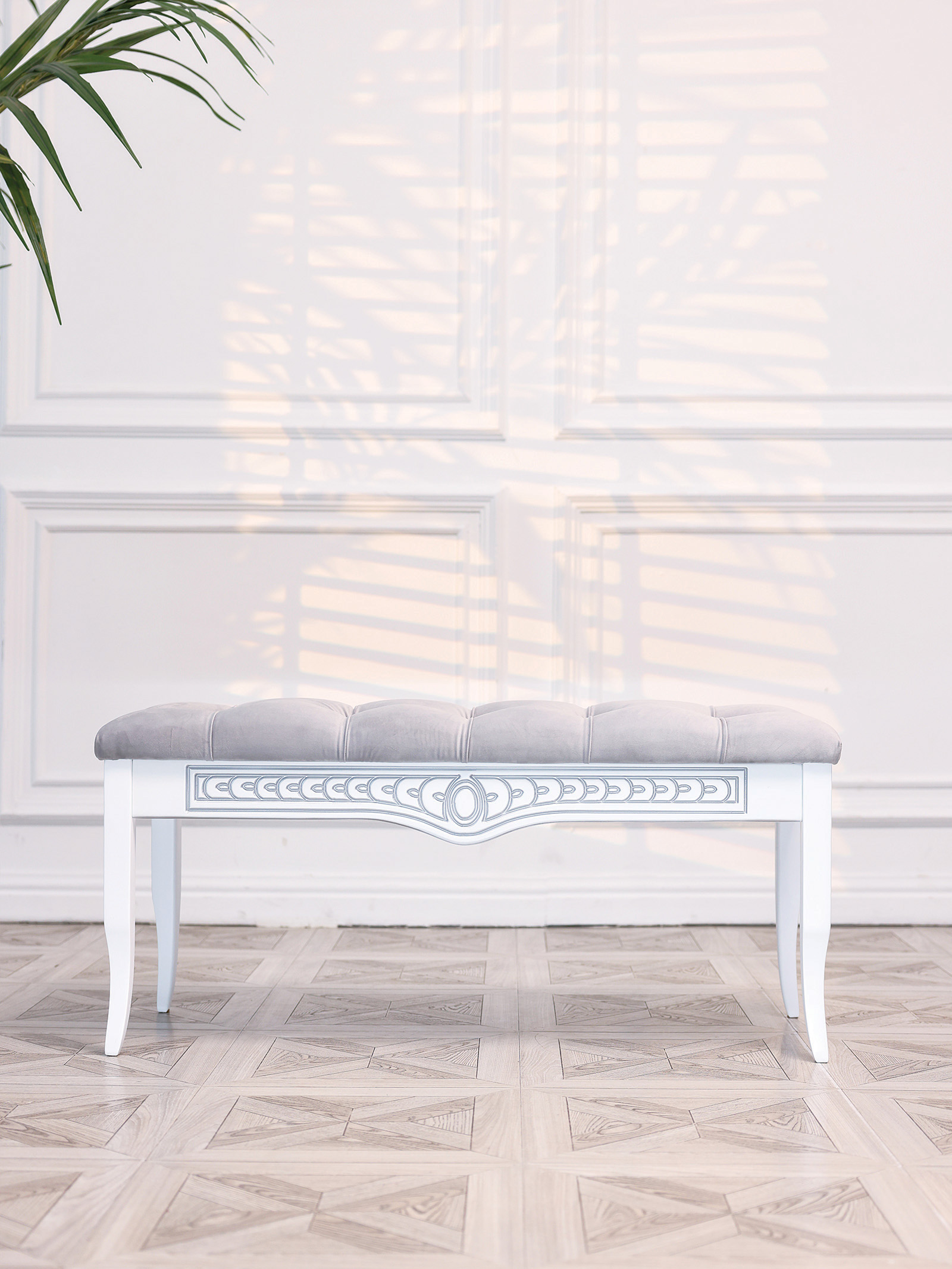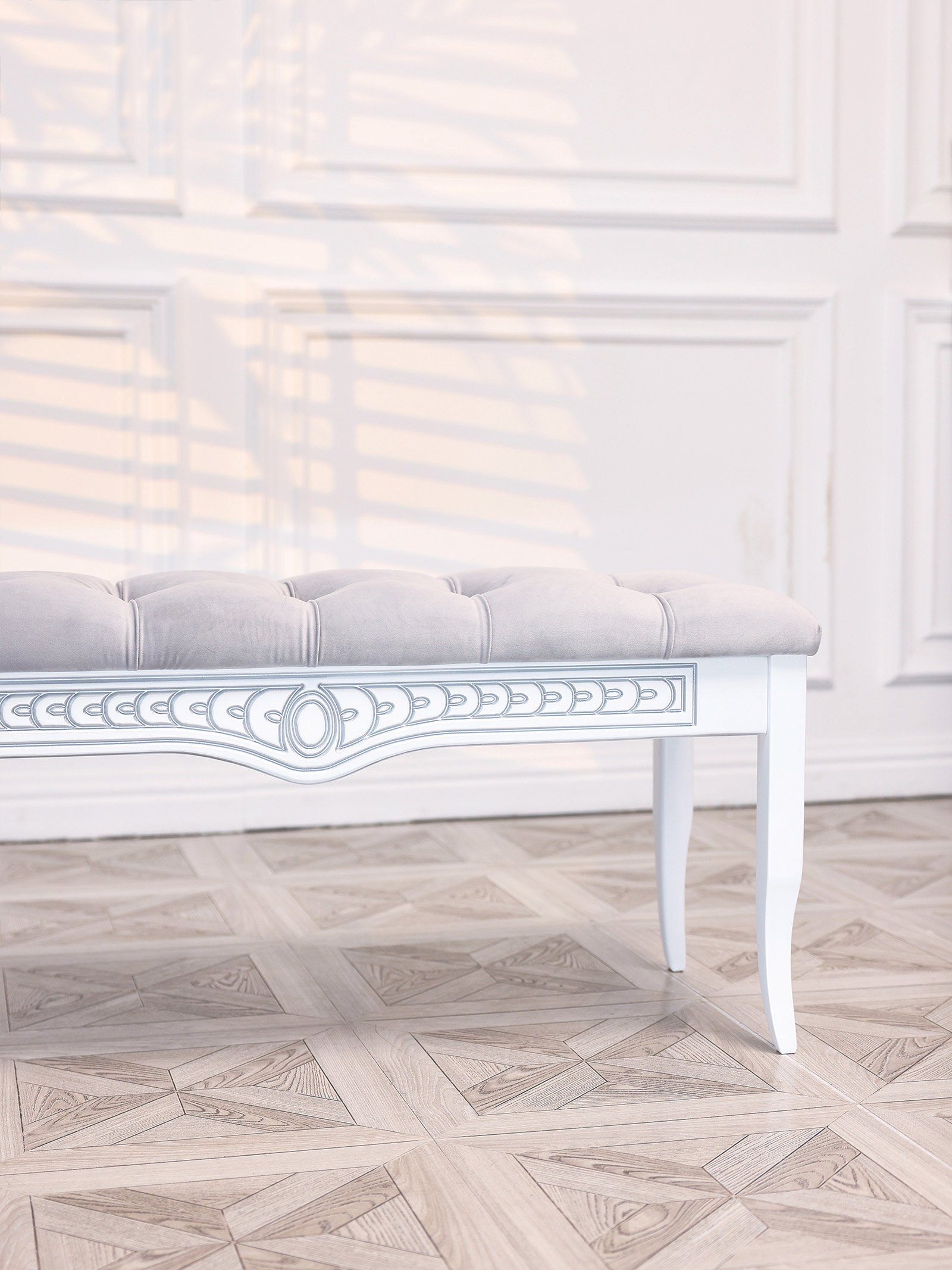 Роскошная банкетка в классическом стиле идеальное дополнение в любой интерьер. Уникальный дизайн, созданный профессионалами, сочетает в себе современные минималистичные мотивы, а также незыблемую классику. Материал банкетки - бук, долговечный, прочный, а также натуральный и невероятно приятный на ощупь. Благодаря уникальным итальянским и немецким швейным машинам мы создали уникальный шов, который делают при создании обивки немецких и итальянских автомобилей. Наша банкетка - универсальный предмет мебели для гостиной и спальни может использоваться разными способами. Прикроватная банкетка в изножье кровати, для складывания покрывала перед сном или одежды. Идеально подойдет для туалетного столика. Пуфик в прихожей, на котором можно присесть и комфортно обуть обувь. Посадочные места на маленькой кухне: вместо кухонного дивана поставьте пару банкеток - диванов. Вы можете задвинуть банкетку под стол и она не будет мешать. Банкетку - диван подойдет для посетителей торговых центров и магазинов, для размещения в примерочной или в торговом зале. На банкетке можно удобно отдохнуть или положить одежду, сумку. Банкетки также используют в офисах, салонах красоты, конференц залах, гостиницах и ресторанах. Ткань легко отмывается, а ножки легко вкручиваются. Сборка занимает не более 5 минут.