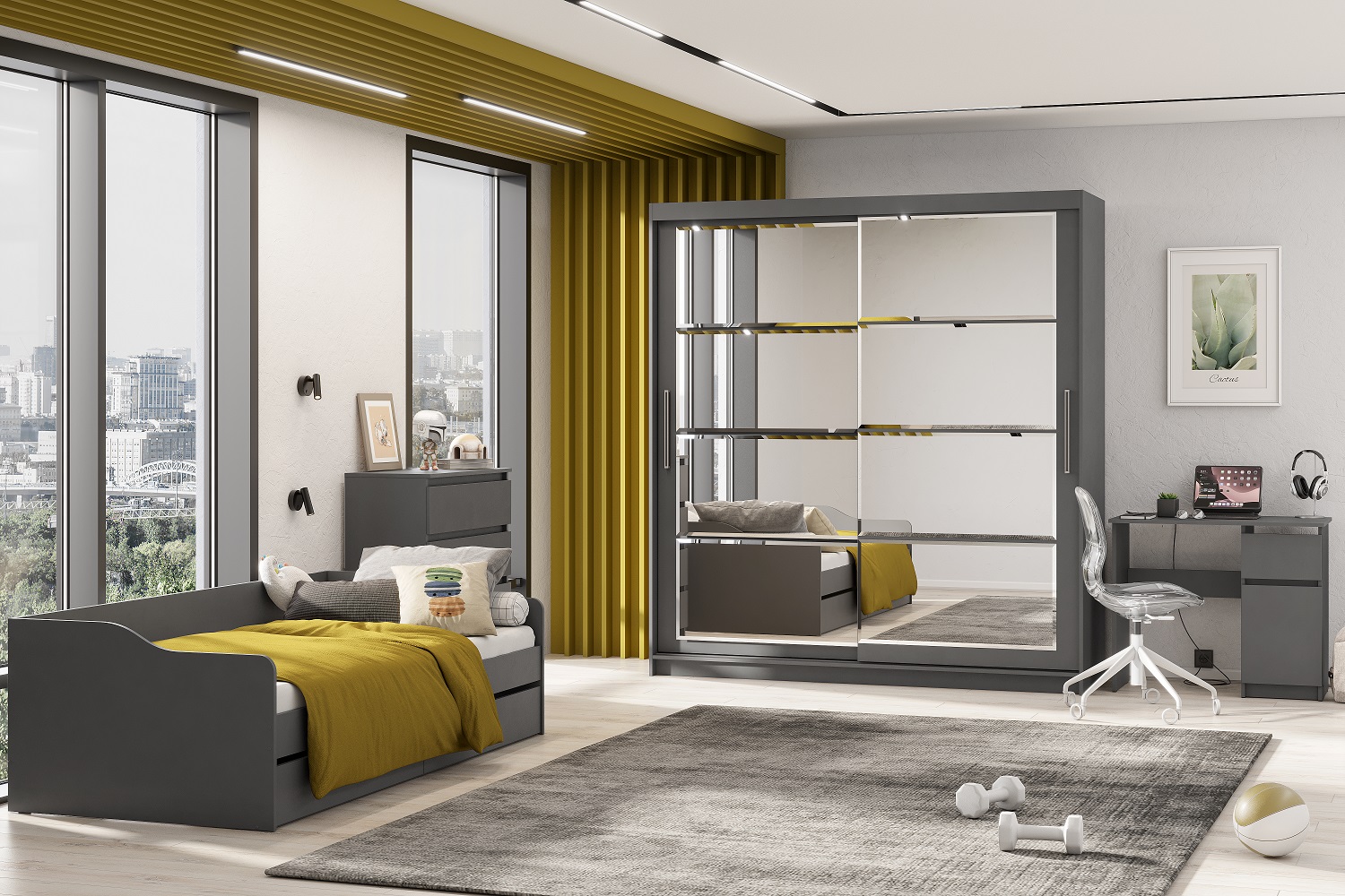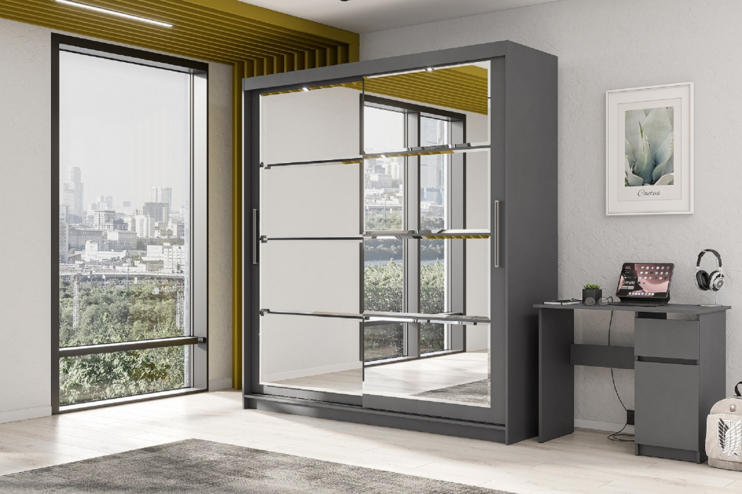 Шкаф-купе №3 — это вместительный и эргономичный шкаф, который станет удобным местом для хранения вещей и стильным элементом интерьера гостиной или спальной комнаты. Его светлые фасады, укрытые стеклом, и огромная зеркальная панель с фацетом визуально расширяют пространство, легко сливаясь в композицию с окружающей мебелью.