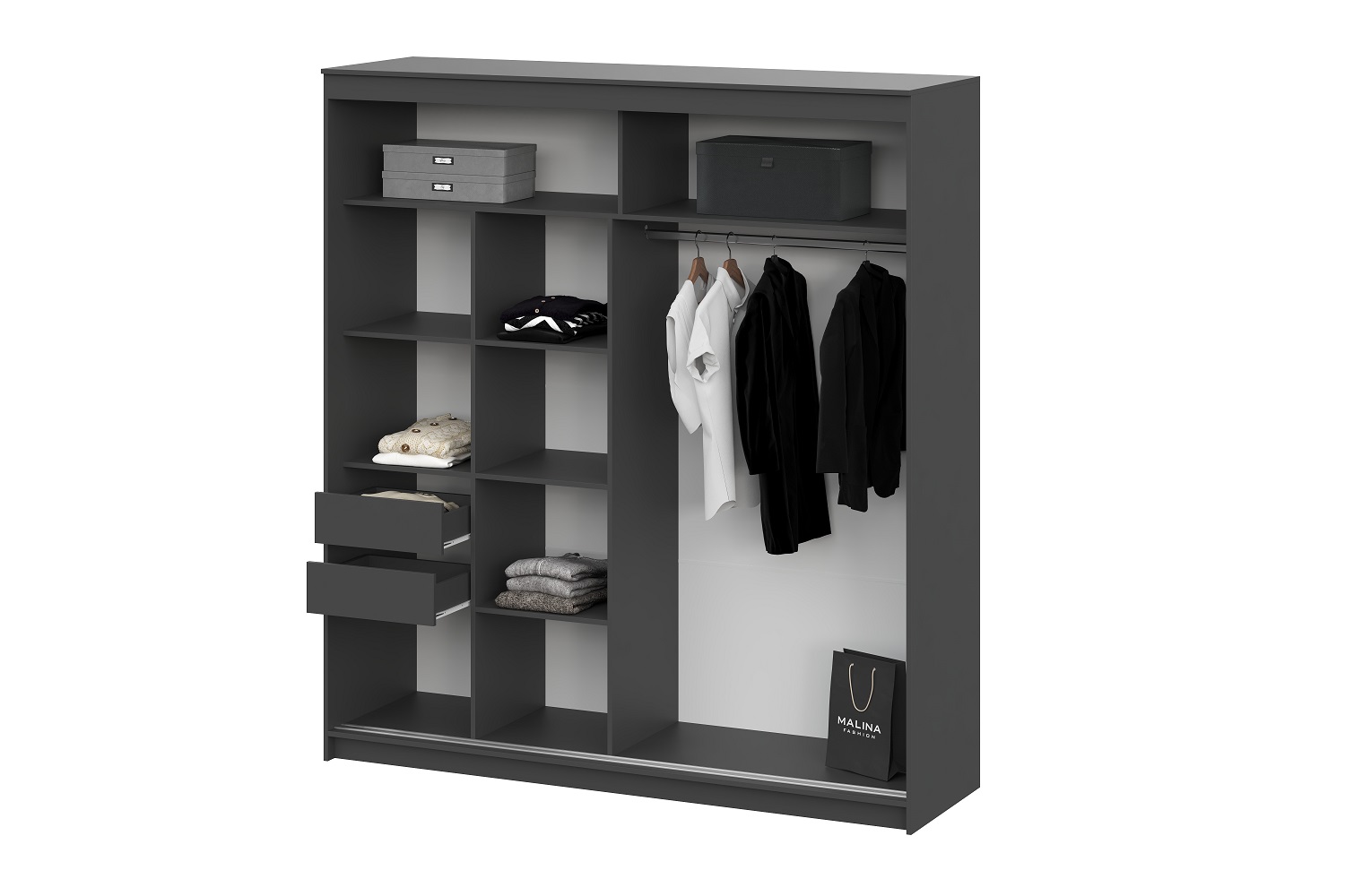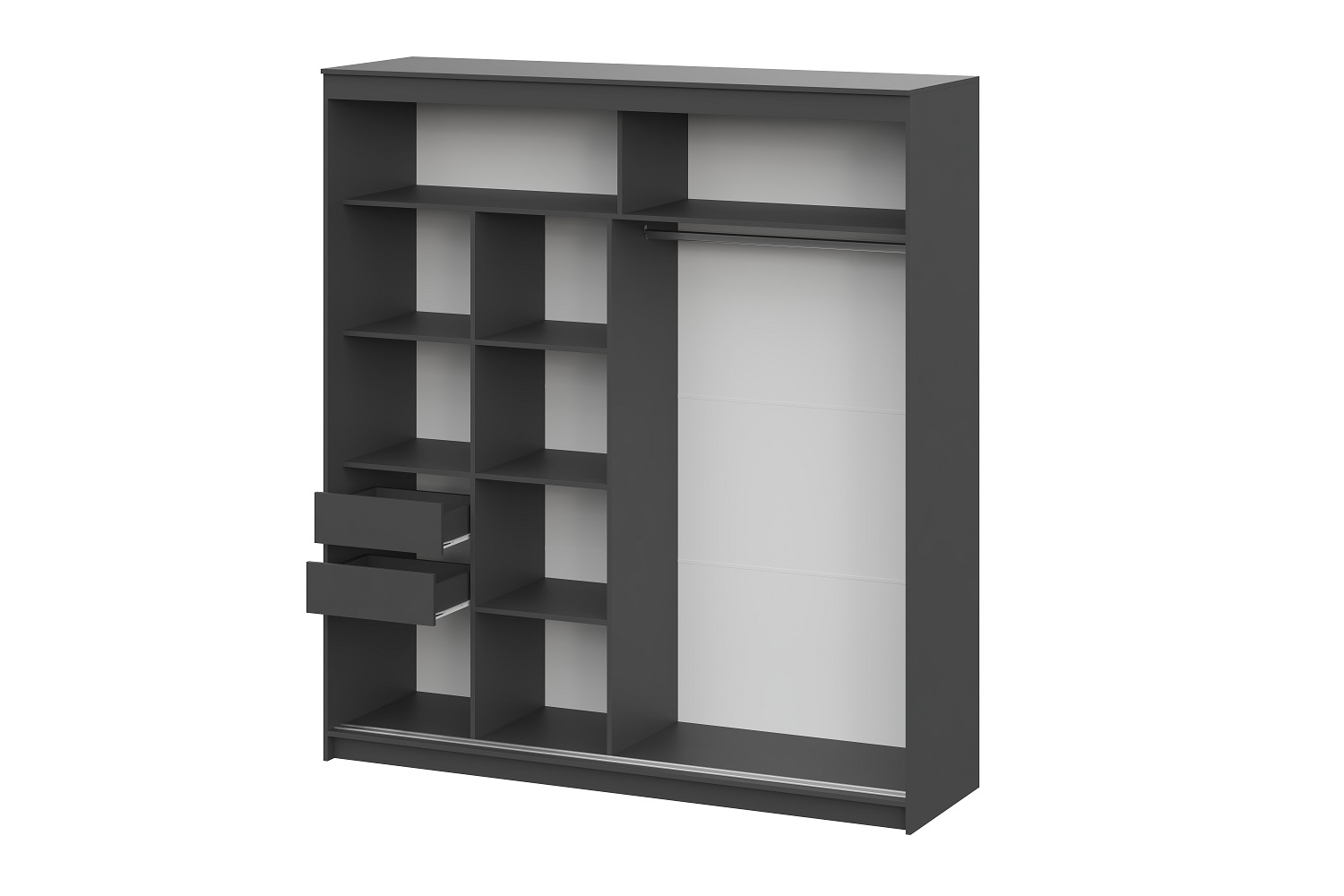 Внутреннее наполнение шкафа включает удобные полки и два выдвижных ящика с одной стороны, а также вместительную платяную секцию с надёжной металлической штангой для одежных вешалок за другой створкой. Нижнеопорная система раздвижных створок обеспечивает лёгкое и ровное открытие.