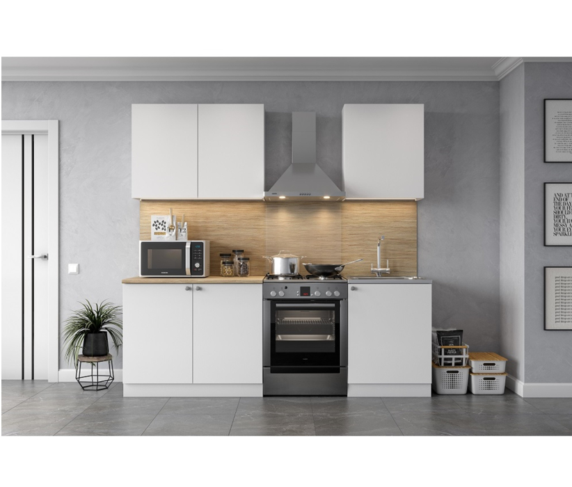 Готовый кухонный гарнитур из ЛДСП с продуманным наполнением и столешницей "тростник" 26 мм. Отсутствие ручек на фасадах верхних модулей - это не только визуально привлекательно, но и удобно при ежедневном нахождении на кухне.