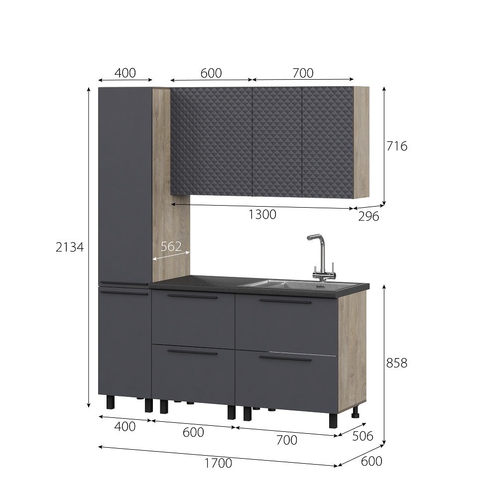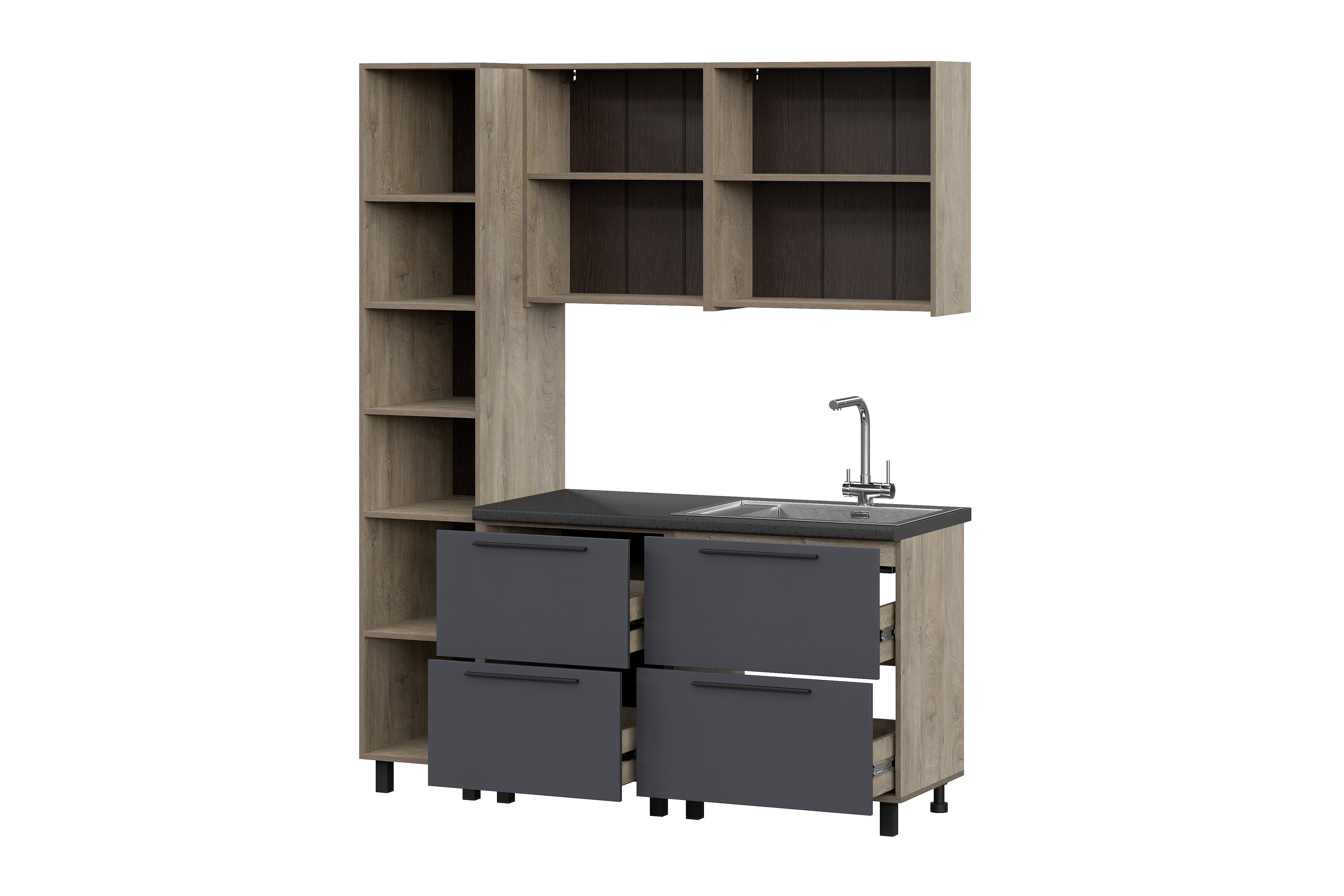 Модульная кухня Этна Софт Графит выполнена в современном стиле и сочетает в себе глубокий темно-серый оттенок фасадов и древесный декор корпуса. Актуальное исполнение, продуманное наполнение шкафов, фурнитура европейского качества и возможность создать уникальный комплект – это еще не все преимущества серии. Особенностью выступают 3Д фасады Гиза.