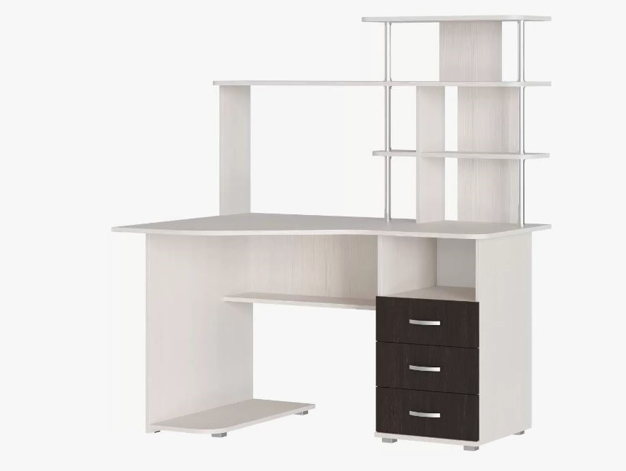 Компьютерный стол Форест оборудован просторной столешницей анатомической формы, тремя выдвижными ящиками на роликовых направляющих, а также комплектом открытых полок под оргтехнику и системный блок. На полках хватит места для органайзера, небольшого количества книг и предметов декора. Цвет ЛДСП венге/лоредо прекрасно дополнен стильными ручками прямоугольной формы, которые комфортны при частом использовании.