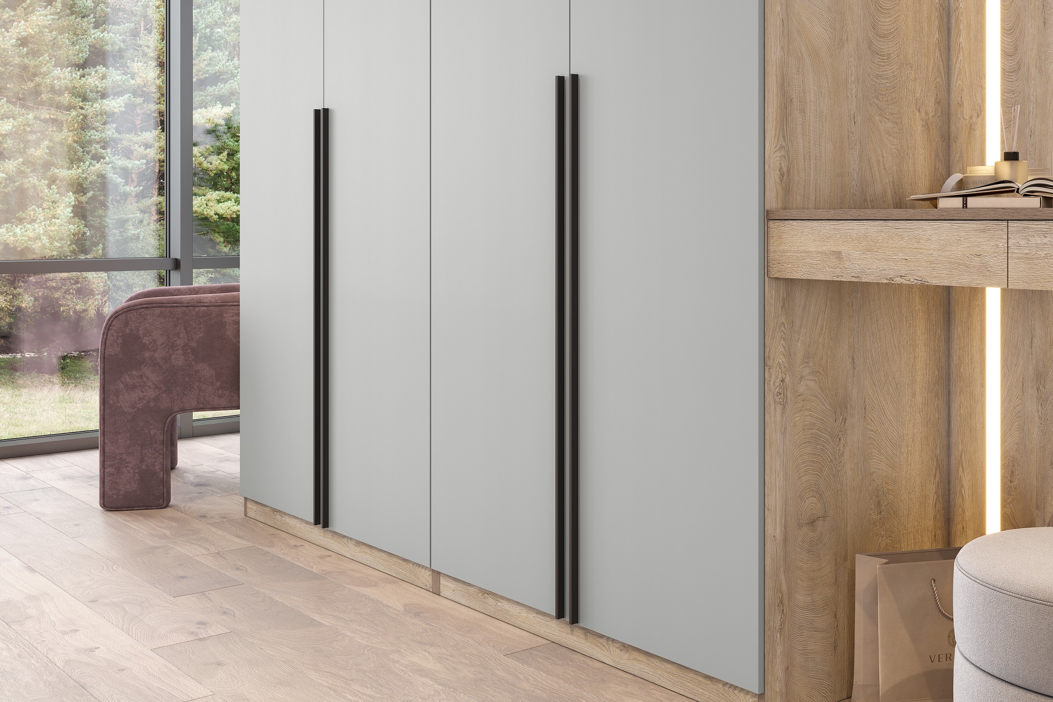 Гардеробная система Этна – это уникальная серия, включающая корпуса, распашные фасады и разнообразное наполнение (ящики, полки, штанги, выкатные брючницы). Вы сможете организовать продуманное хранение одежды и вещей в любом помещении, от прихожей до рабочего кабинета, с учетом его размера и Ваших запросов. Трендовый декор фасадов «софт грей» гармонично дополняет сложный древесный декор корпуса «дуб эндгрей».