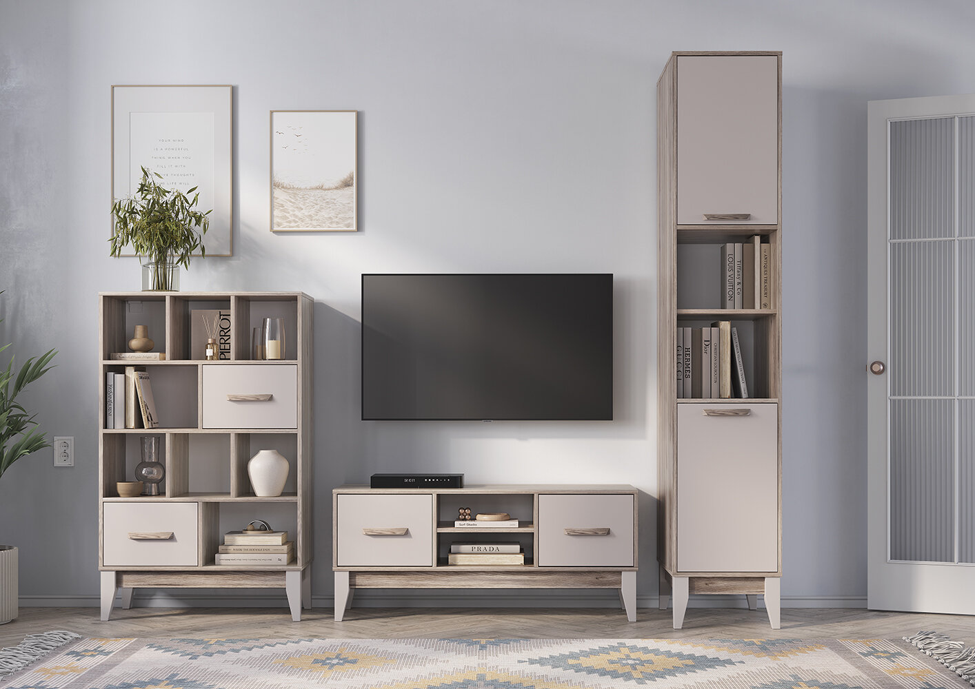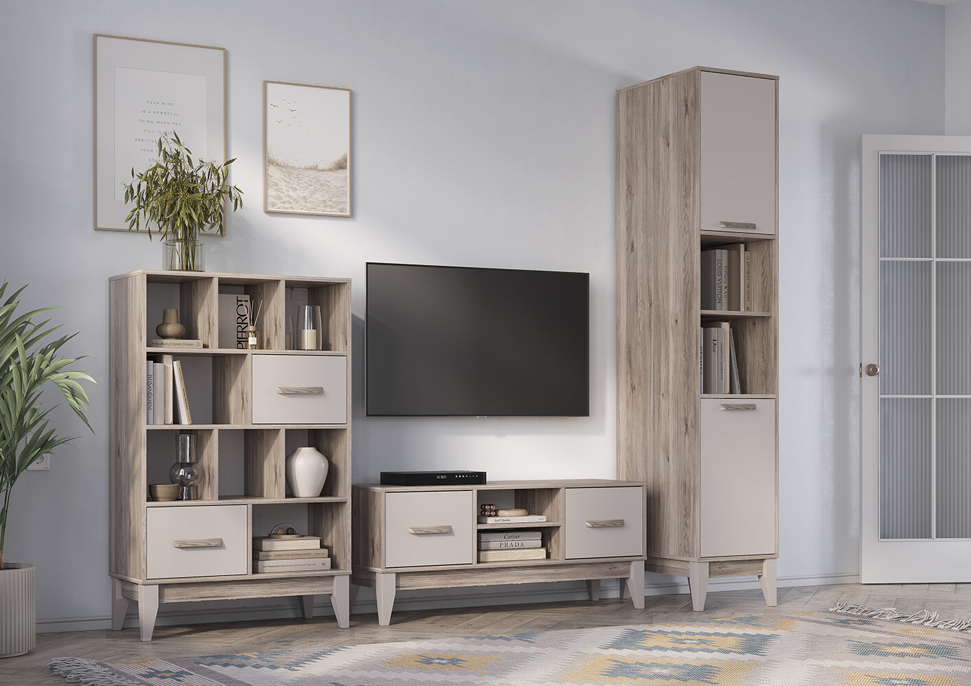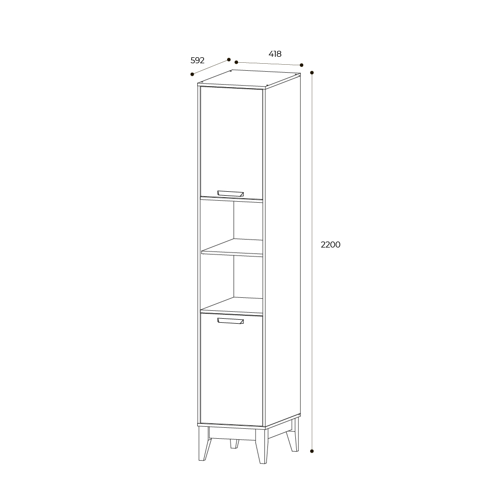 Пенал из модульной серии Скандика состоит из четырех полок, скрытых за дверцами и двух открытых полок, на которых можно разместить книги, документы, предметы декора, игрушки и одежду. Ручки повторяют текстуру корпуса «дуб смоки», а створки плотно фиксируются на магнитах.