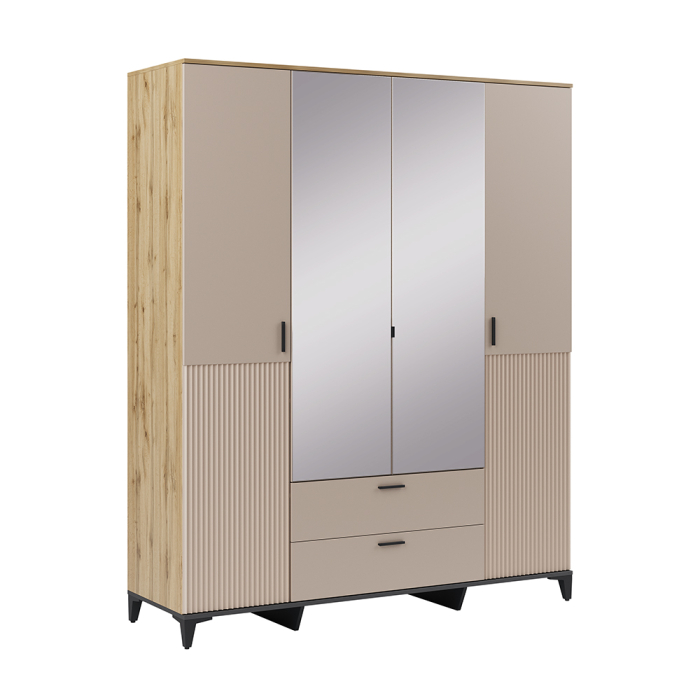 Вместительный 4-х дверный шкаф включает в себя два выдвижных ящика, отсек со штангой для одежды, два отдела с многочисленными полками. Зеркальный фасад визуально облегчает конструкцию шкафа и добавляет воздуха интерьеру, в котором он расположен.