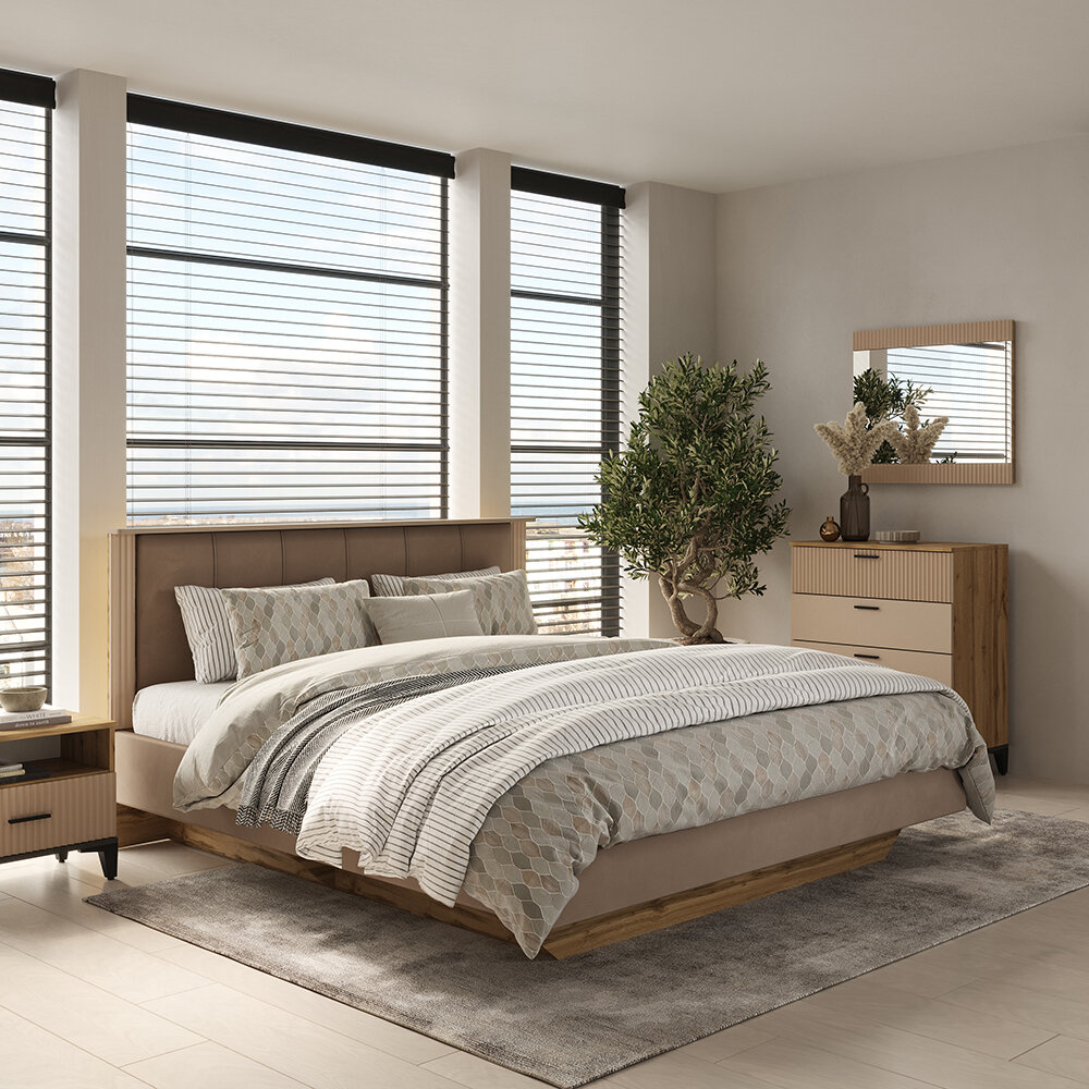 Модульная коллекция Дюна поможет создать изысканный и уютный интерьер для вашей спальни. Каркасы в древесном декоре эффектно сочетаются с фрезерованными фасадами кофейного оттенка.