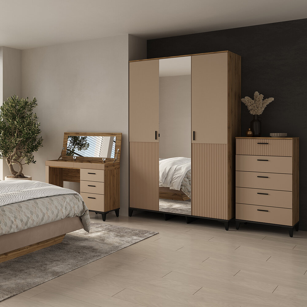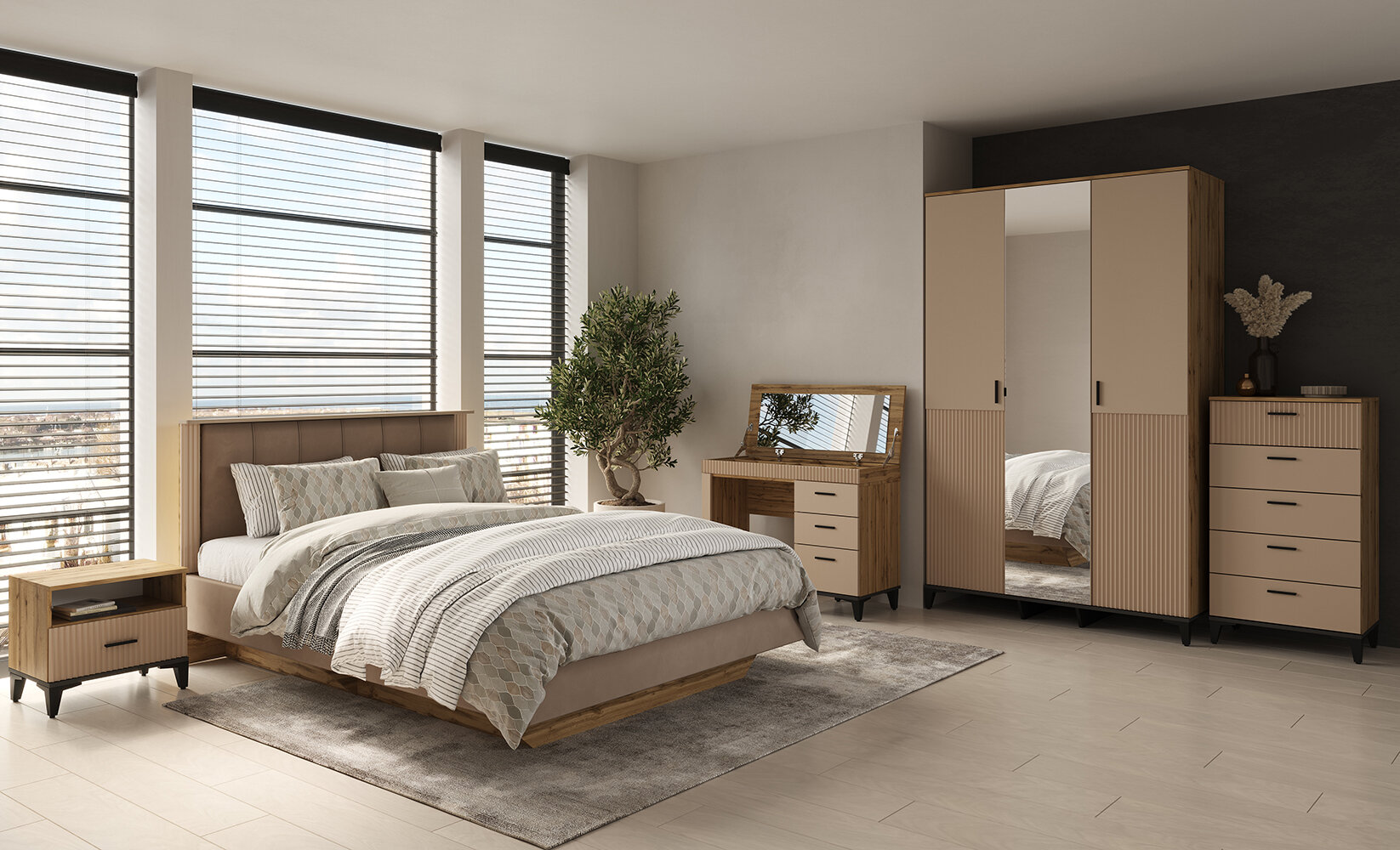 Модульная коллекция Дюна поможет создать изысканный и уютный интерьер для вашей спальни. Каркасы в древесном декоре эффектно сочетаются с фрезерованными фасадами кофейного оттенка.