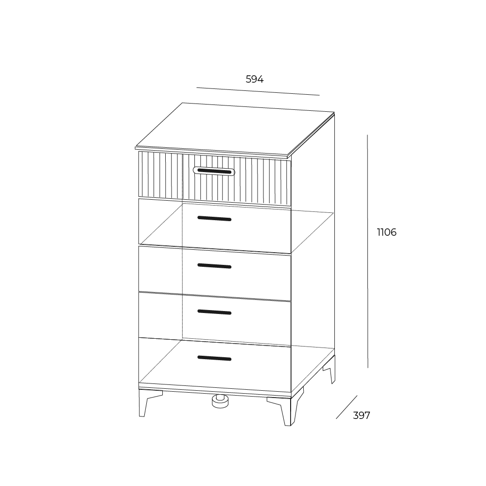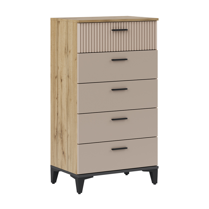 Компактный комод с пятью выдвижными ящиками поможет организовать место для хранения, не загромождая пространство комнаты.
