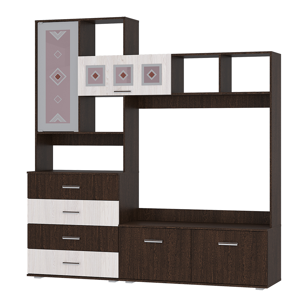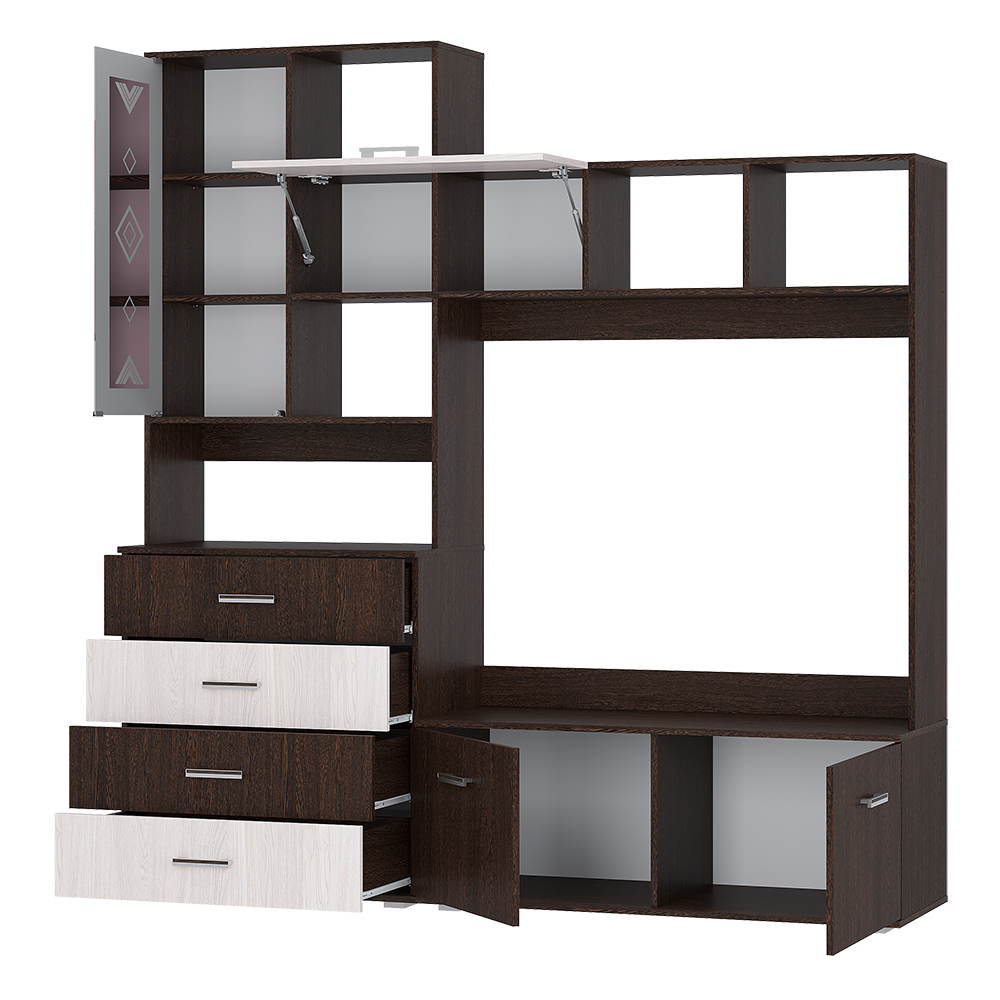 Центральная секция - 2000х2120х470 мм. Центральная секция состоит из комода с четырьмя выдвижными ящиками, тумбы под ТВ с диагональю до 40 дюймов, а также множества закрытых и открытых полок для различных мелочей.