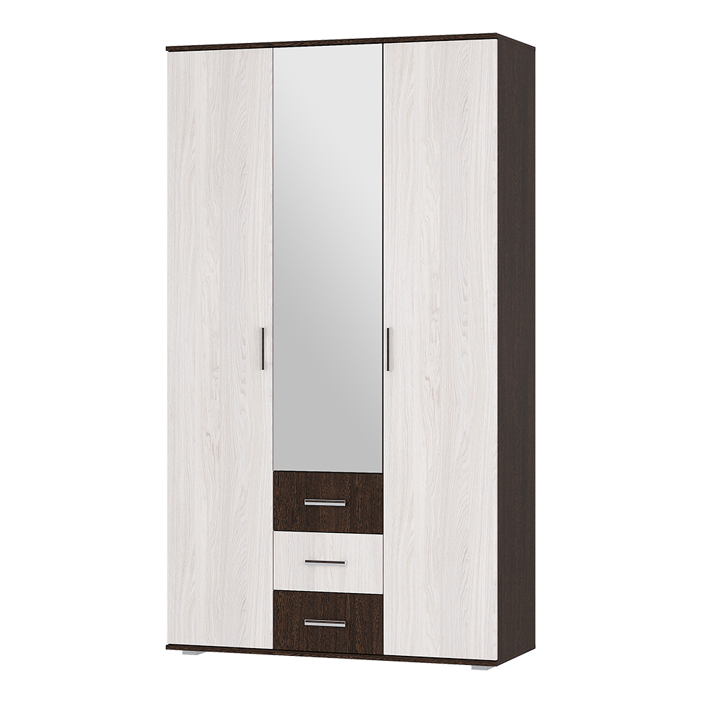 Шкаф трехдверный Белла имеет 3 ящика, зеркальную дверь. Шкаф оснащен металлической штангой и отсеком с полками для одежды.