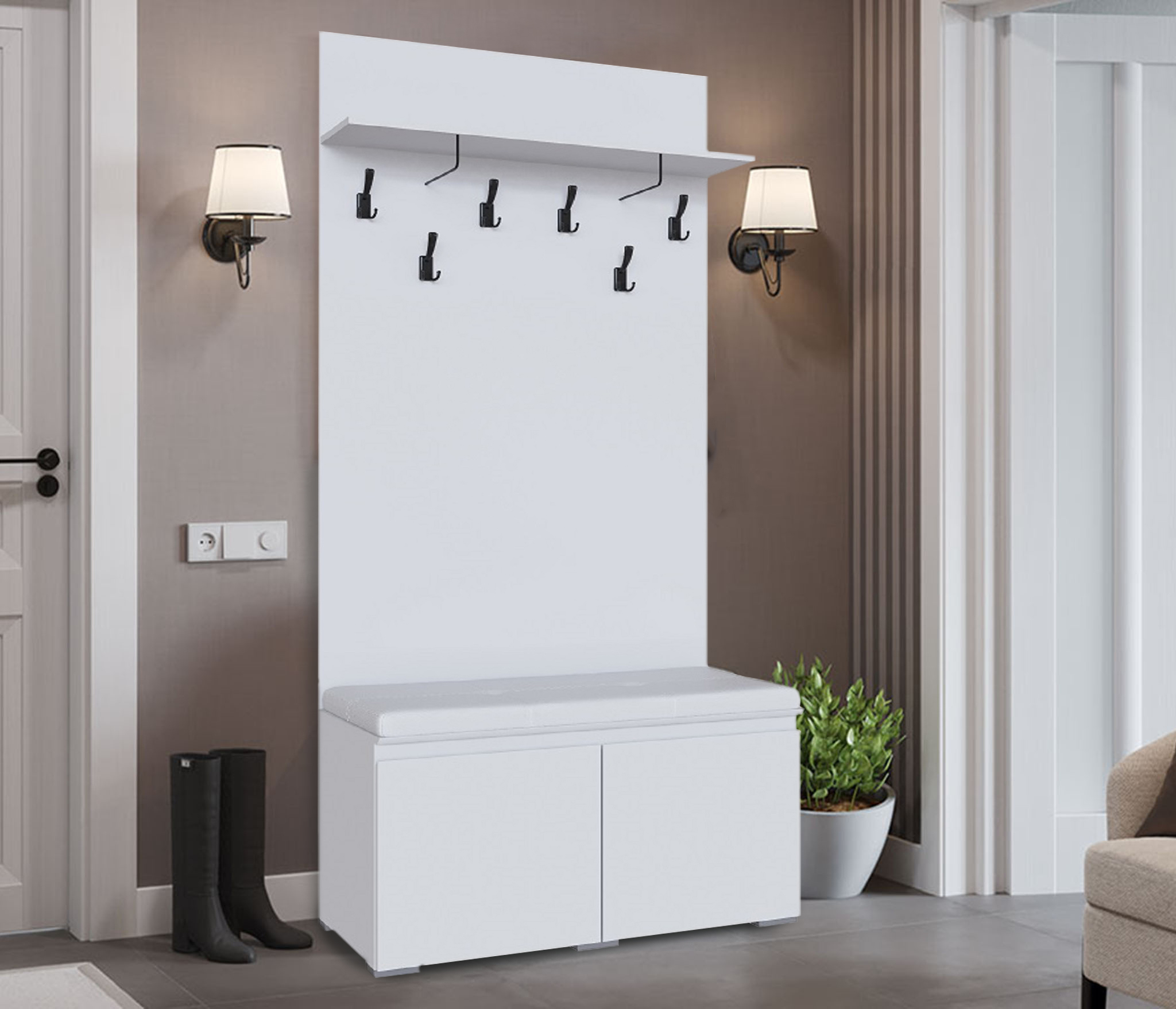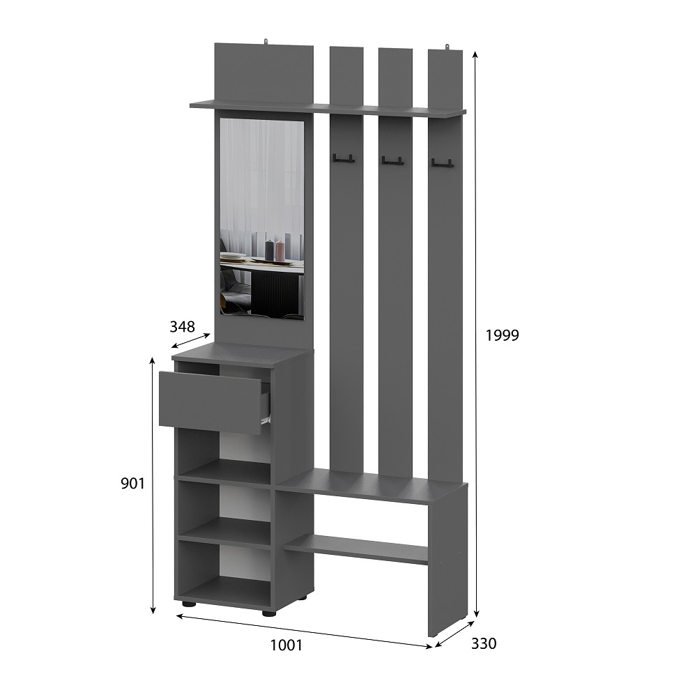 Вешалка Денвер в цвете графит поможет организовать систему хранения гардероба в современном интерьере. Для вашего удобства предусмотрены двухрожковые крючки для повседневной верхней одежды, широкая верхняя полка для головных уборов и шарфов, ниша для обуви, а также выдвижной ящик. За распашным фасадом находятся небольшие полки. Зеркало позволит оценить внешний вид перед выходом из дома.