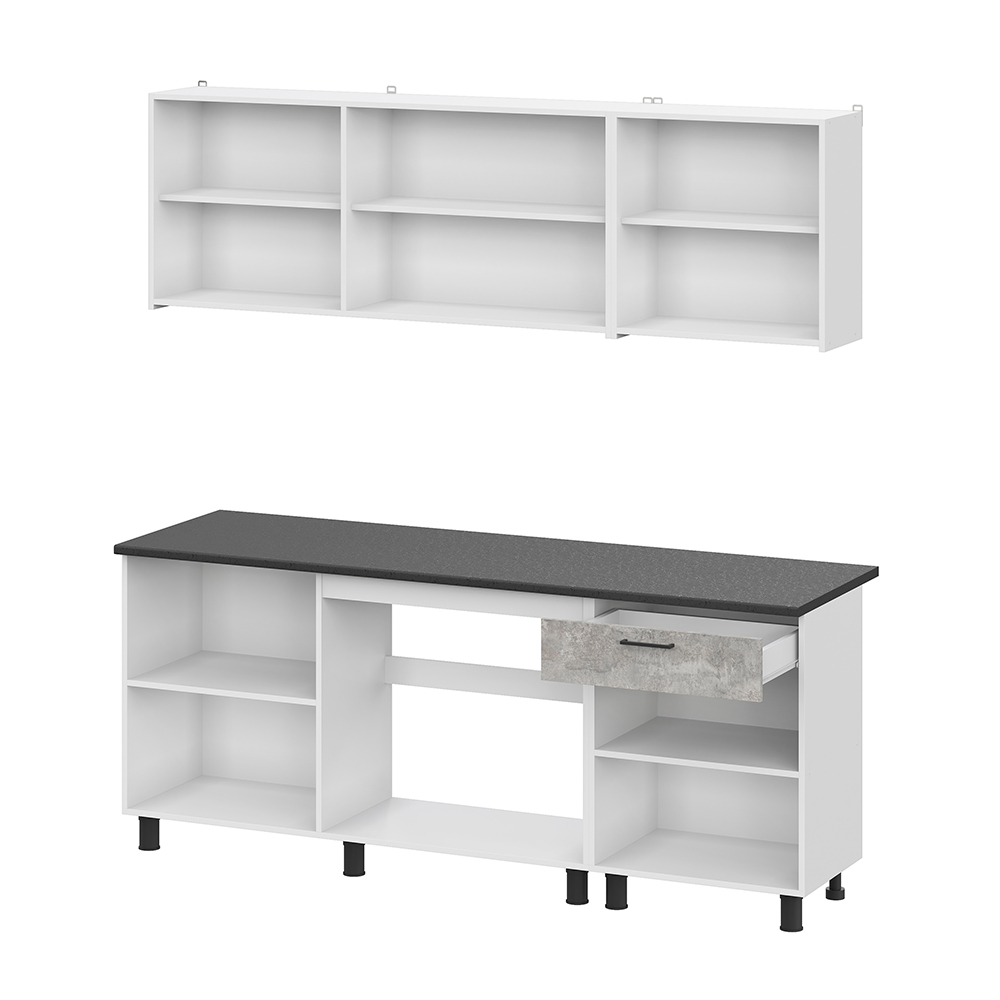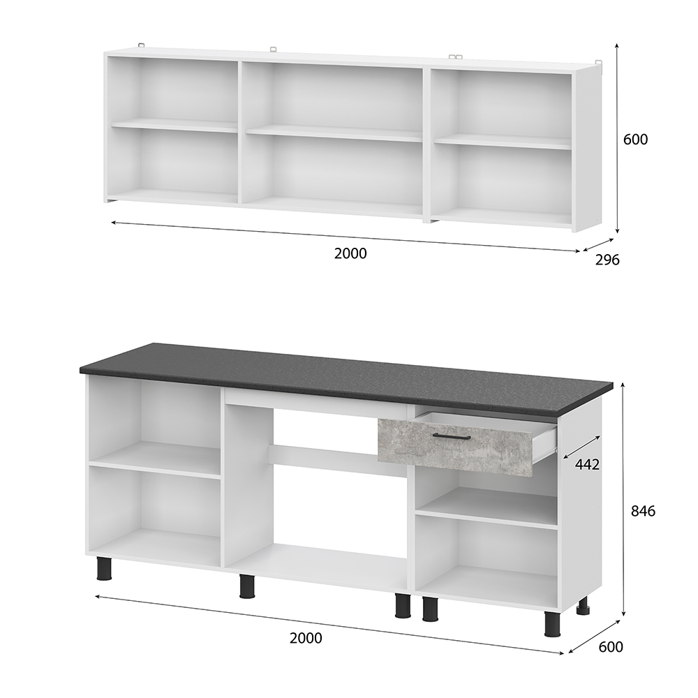 Готовый кухонный гарнитур КГ 9 из ЛДСП с продуманным наполнением и столешницей в черном цвете толщиной 26 мм. Отсутствие ручек на фасадах верхних модулей - это не только визуально привлекательно и подчеркивает минимализм, но и удобно при уборке. Отсутствие ручек акцентирует внимание на стиле и делает кухню современной.