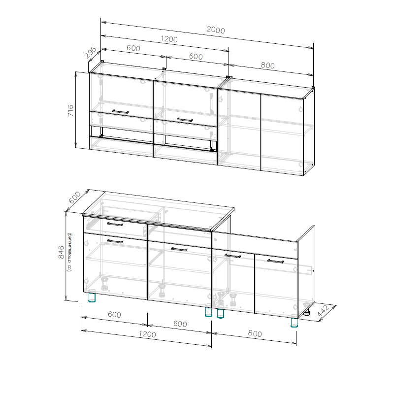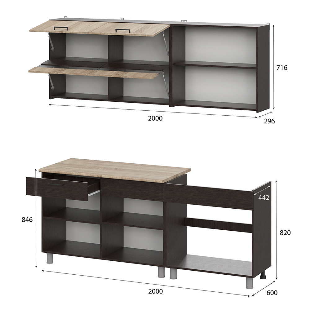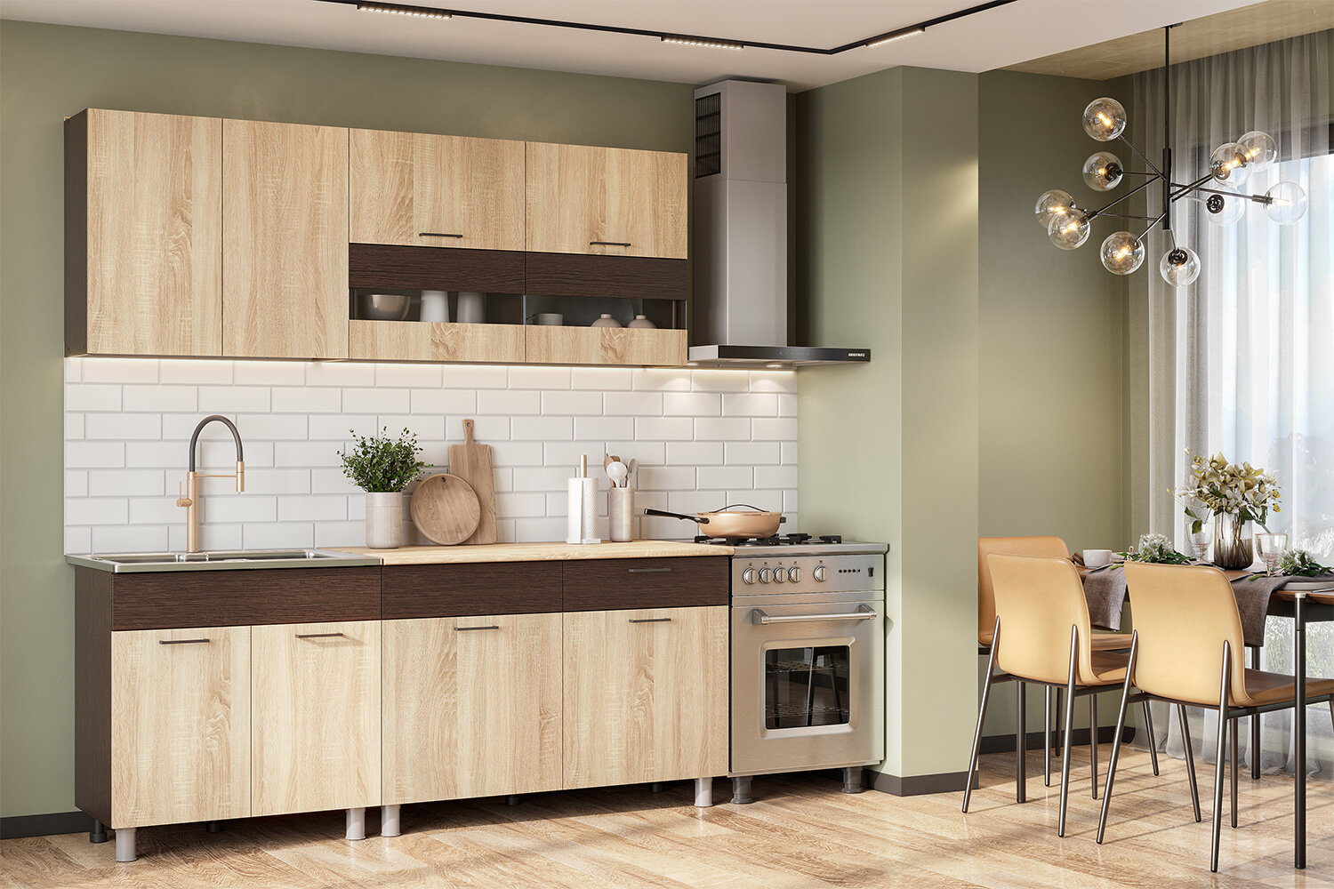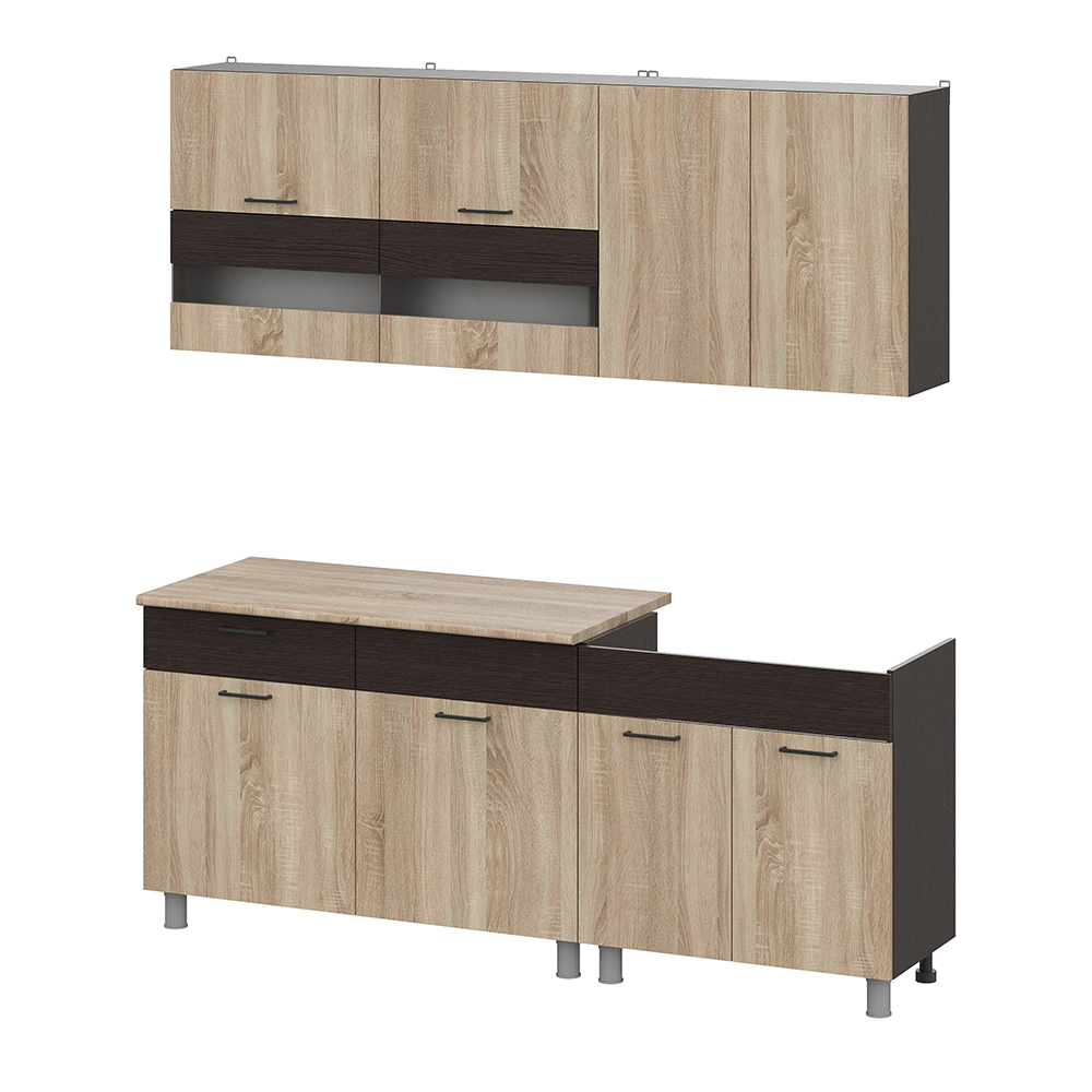 Кухня Босфор – это доступный прямой кухонный гарнитур. Модули выполнены в цветах дуб венге и дуб сонома. В комплектацию входят напольные и навесные шкафы, а также столешница длиной 1200 мм и толщиной 26 мм в цвете дуб сонома, на шкаф-мойку столешница в комплект не входит.