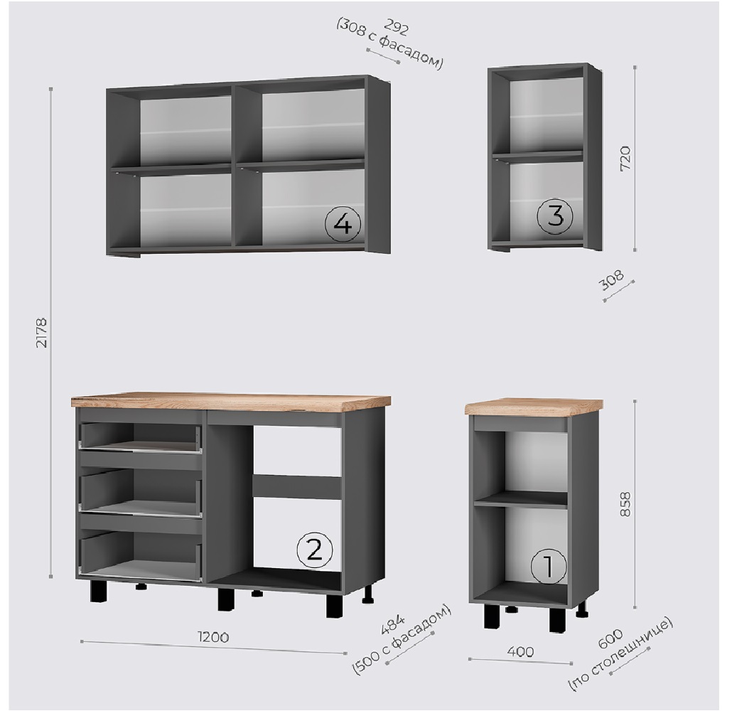 Размеры низ: ширина - 1602 мм, высота - 858 мм, глубина - 600 мм. Размеры верх: ширина - 1600 мм, высота - 720 мм, глубина - 308 мм.