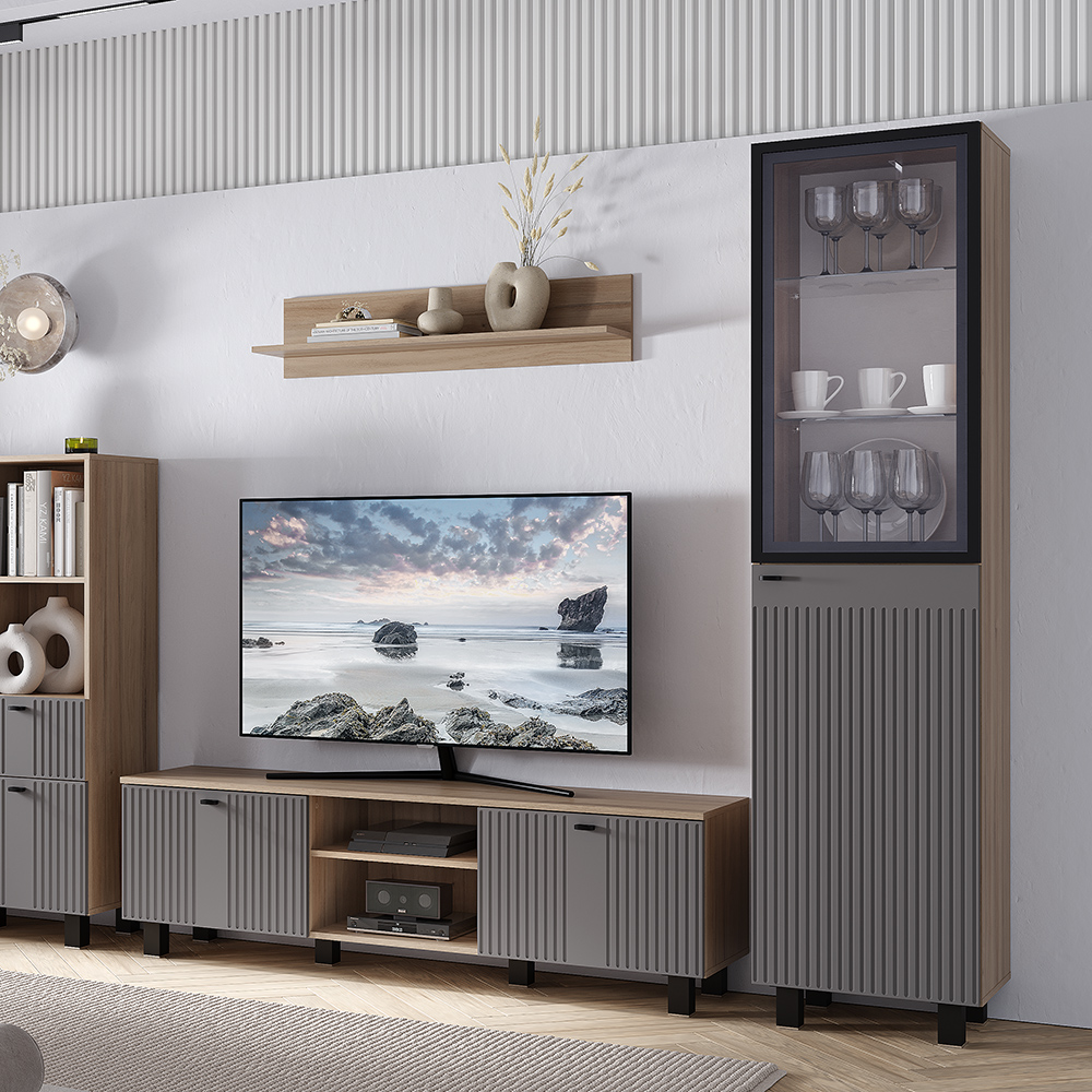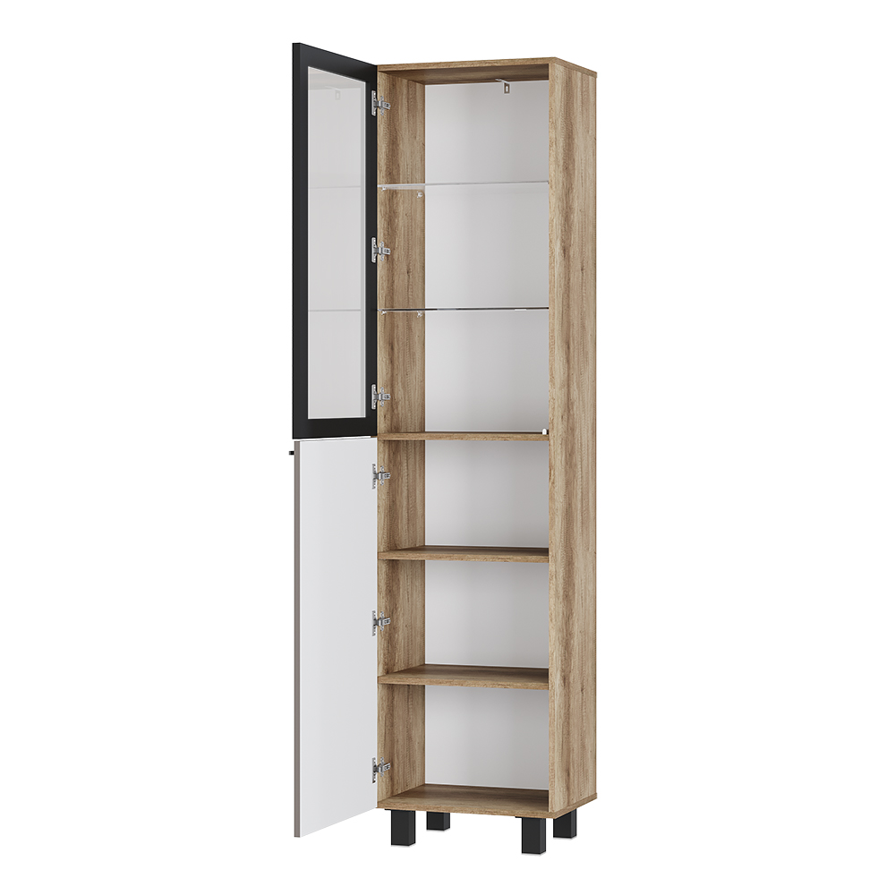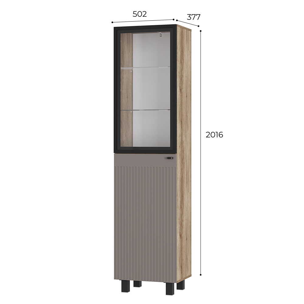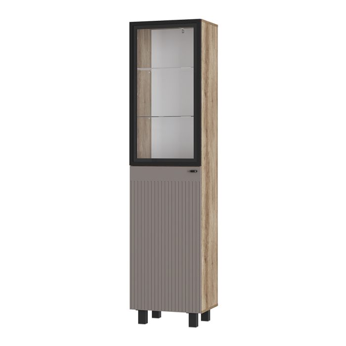 Благодаря компактным размерам шкаф-пенал не займет много места. Вертикальная фрезеровка на фасадах и корпус в древесной гамме придают модульной серии Олива особый шарм и индивидуальность. За стеклянным фасадом располагаются 2 стеклополки и 3 деревянных.