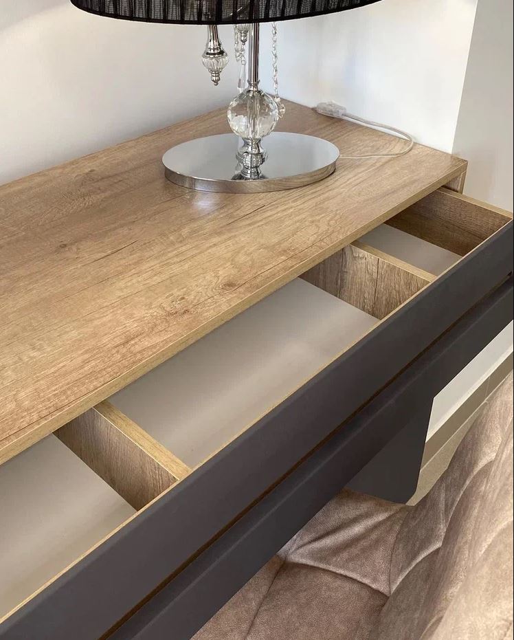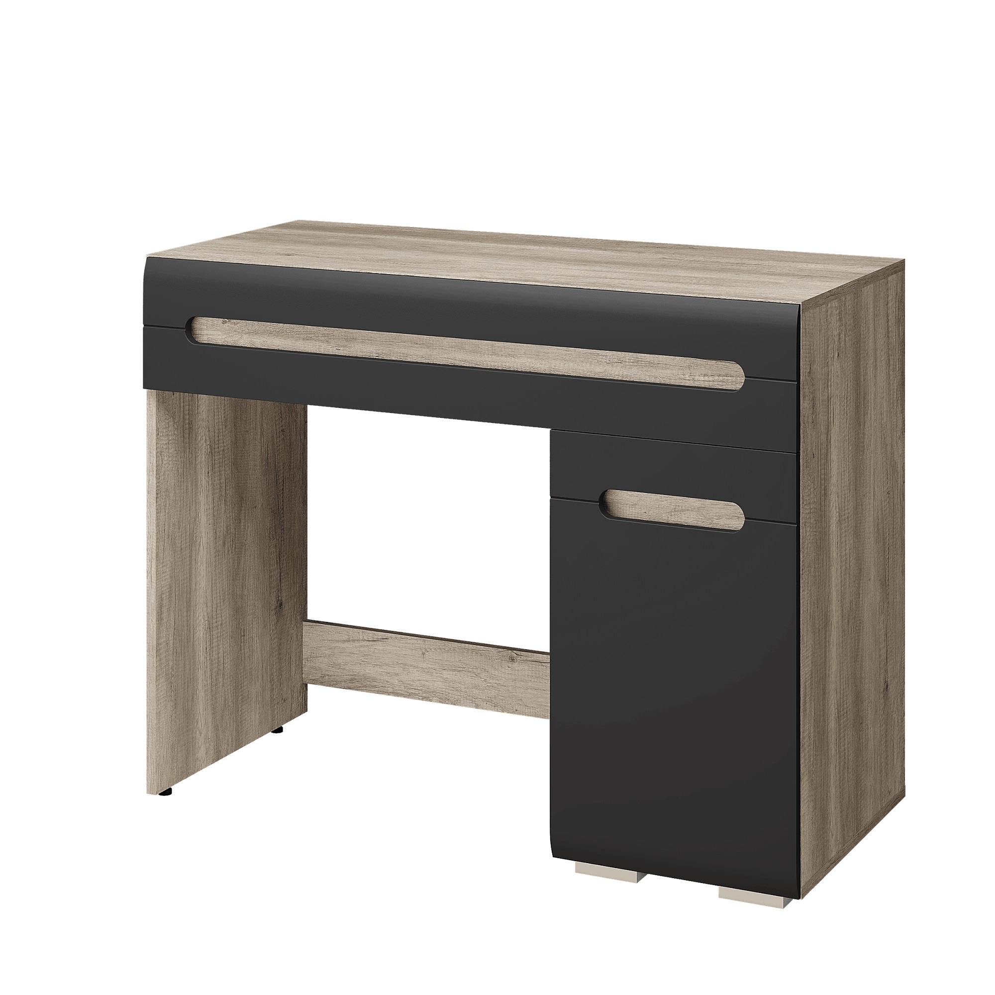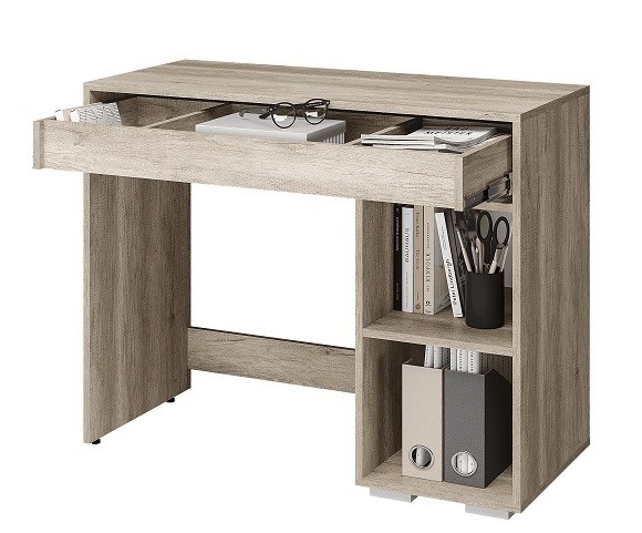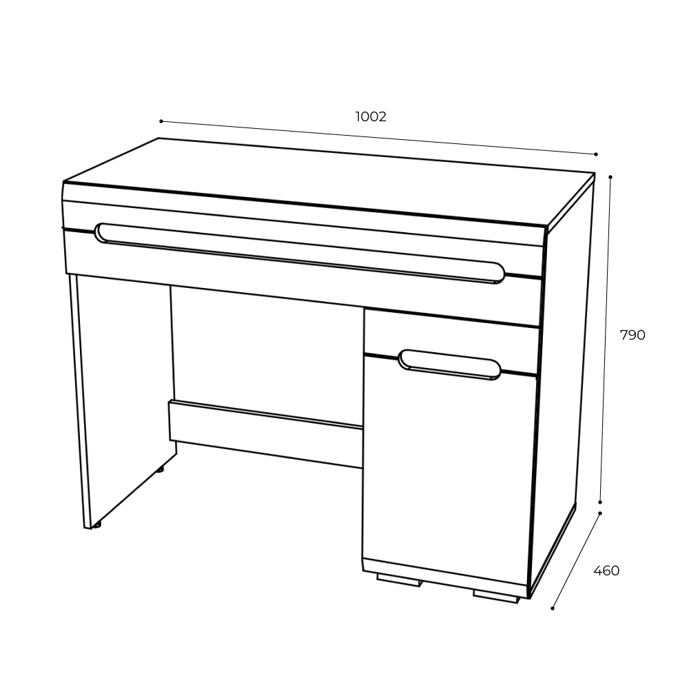 Туалетный стол с широким ящиком и двумя закрытыми нишами. Благодаря универсальной конструкции может использоваться не только в процессе нанесения макияжа, но и для работы или учебы, как письменный стол.