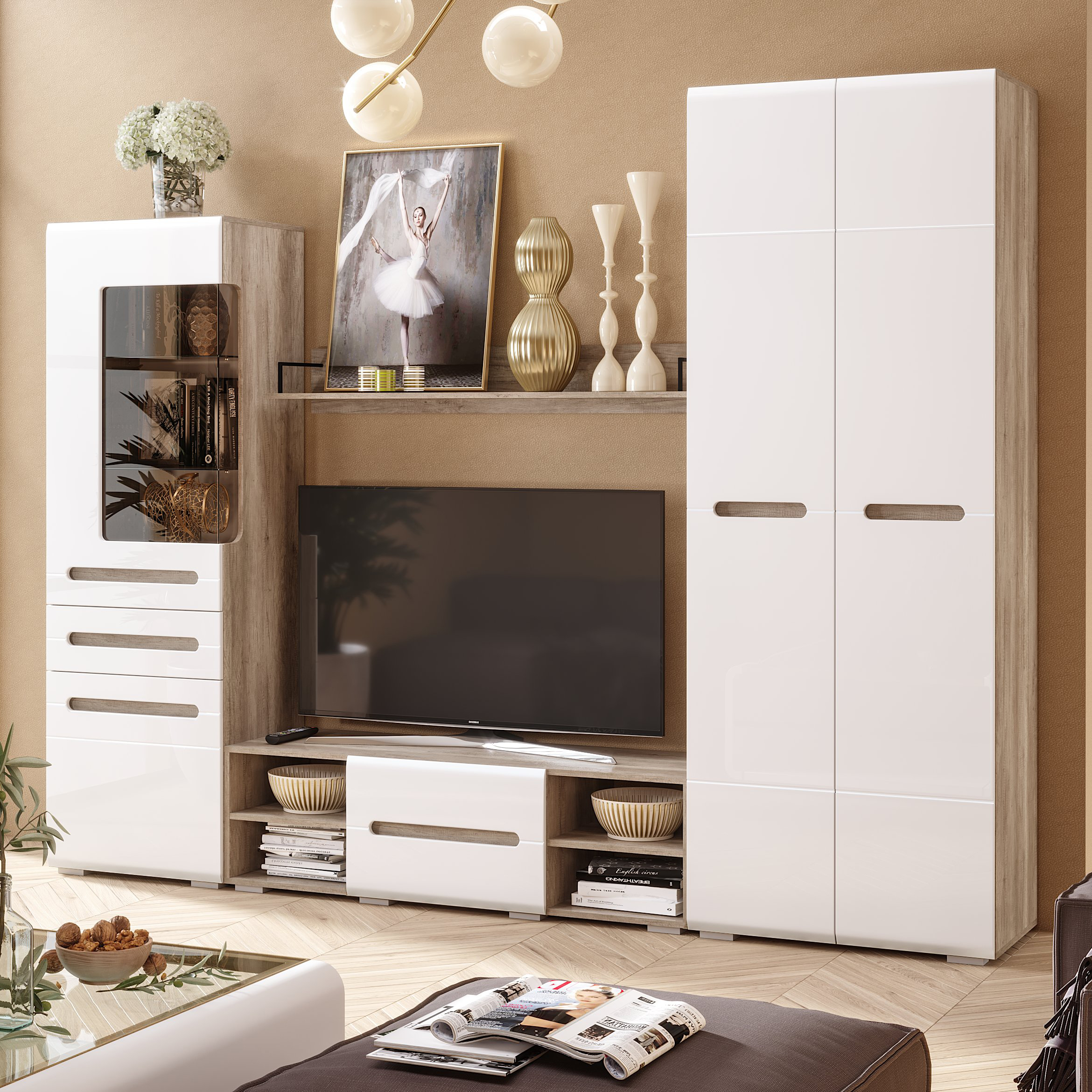 Модульная система НАОМИ - это свежий одухотворенный интерьер, наполненный светом, комфортом и функциональностью. Уникальная геометрия фрезерованных фасадов создает атмосферу ультра-современности и минимализма. Контрастность сочетания матового декора корпуса элитного дерева «Дуб Каньон» с безмятежно-белыми глянцевыми створками относит нас к спокойствию, экологичности и безмятежности. Оригинальное конструктивное решение коллекции – ручки фасадов, выполненные путем сложной фрезеровки и подчеркнутые углубленным декором дубового спила.