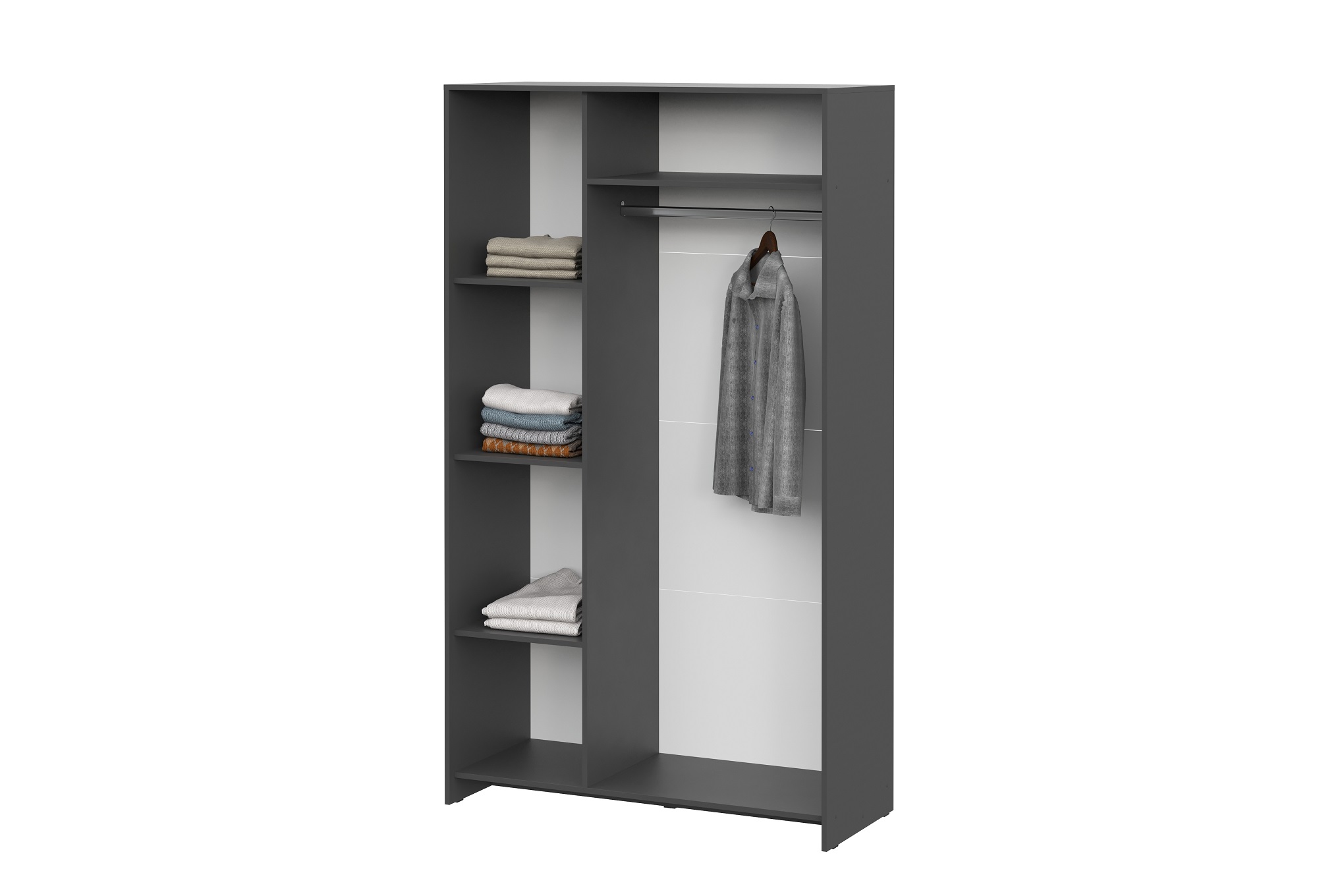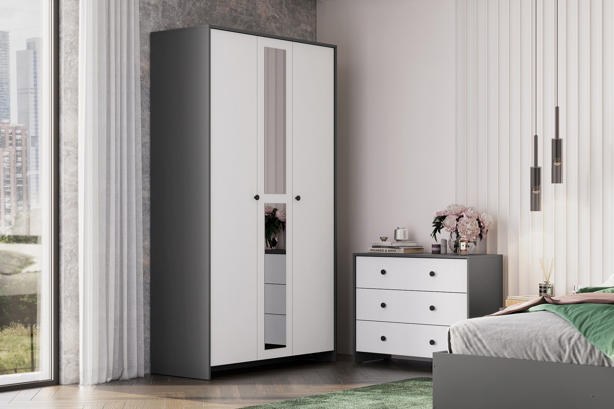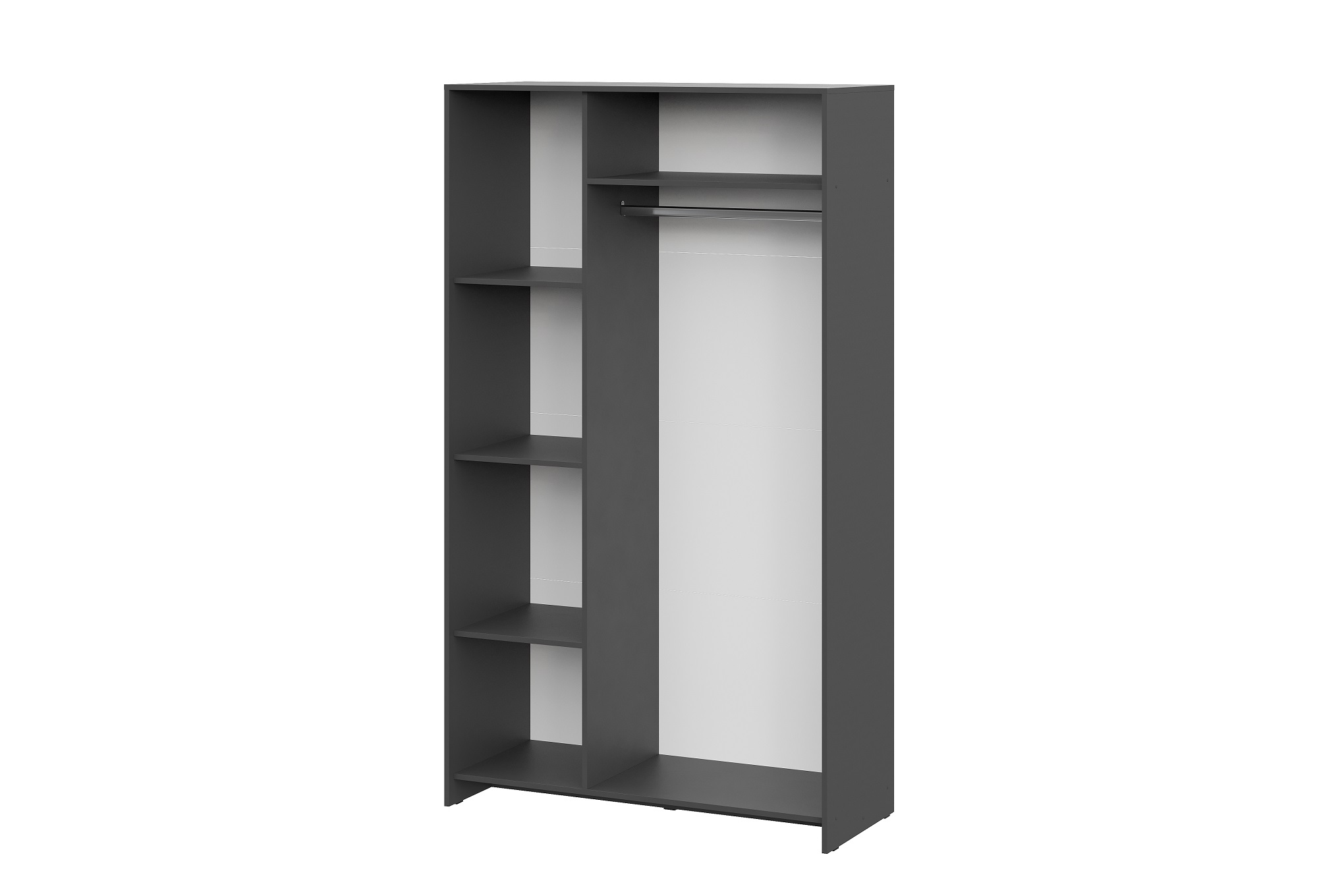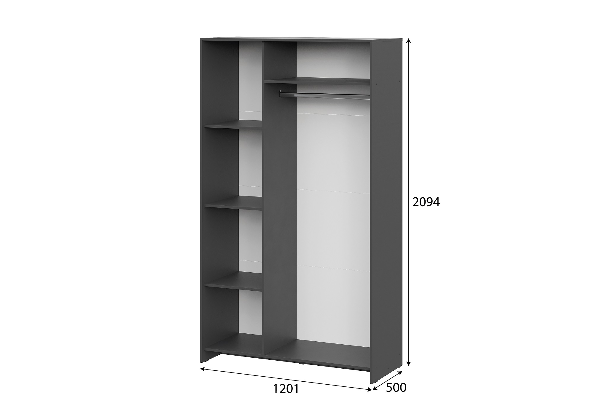 Трёхстворчатый шкаф модульной системы Дольче выполнен в цвете графит/белый. Его размеры: высота — 209,4 см, ширина — 120,1 см, глубина — 50 см. Внутри шкафа есть 3 полки для белья и одна для хранения и продольная штанга для одежды.