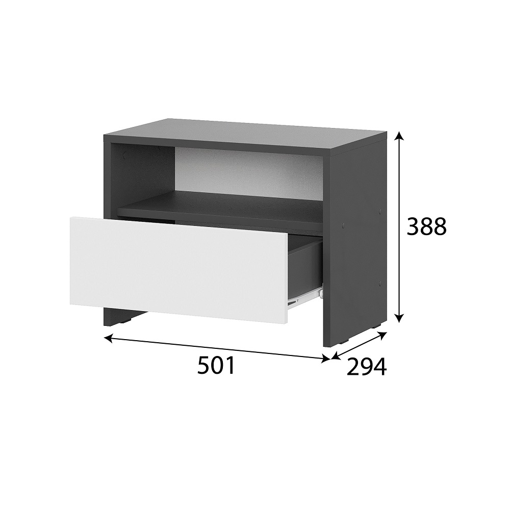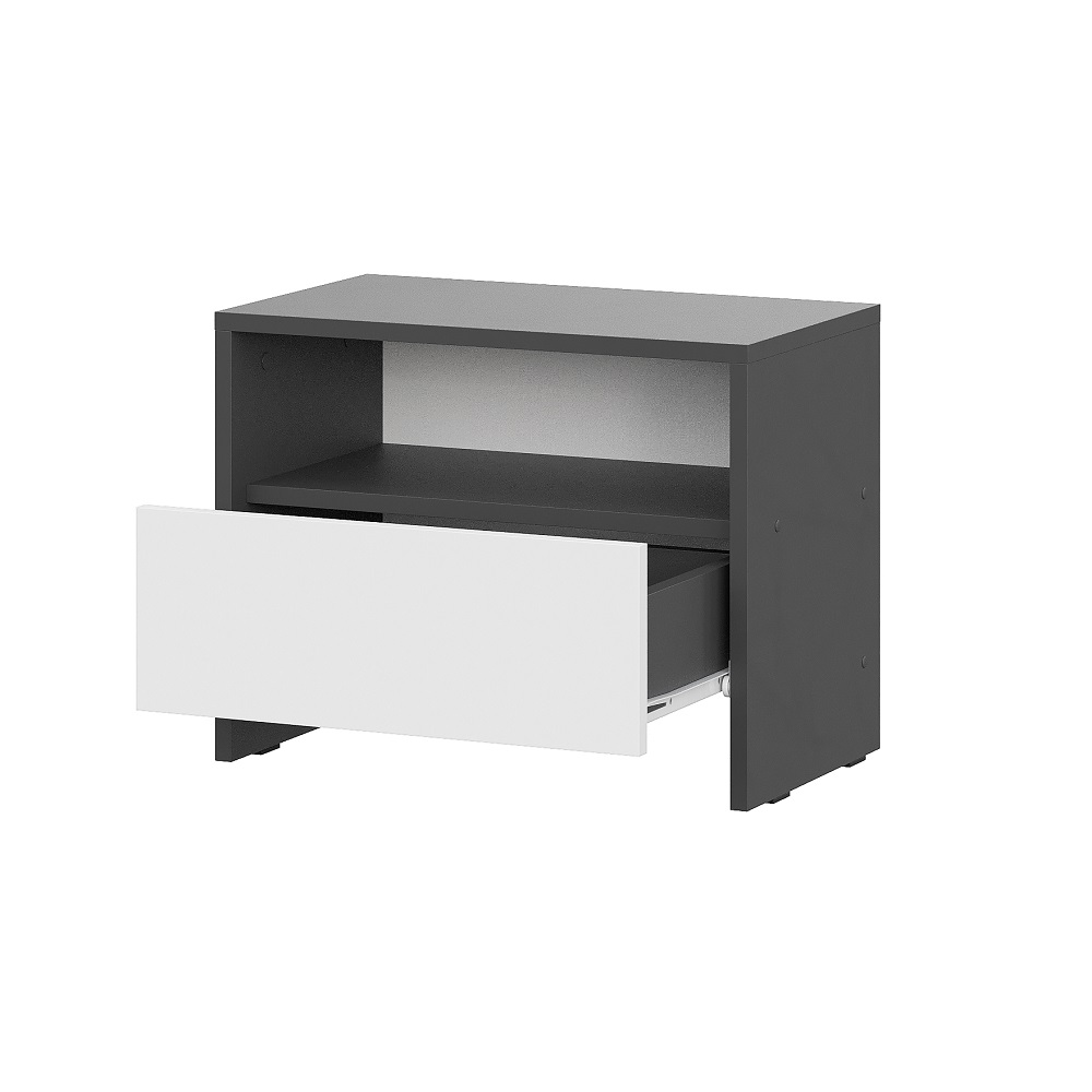 Прикроватная тумба «Дольче» в цвете Графит с белыми элементами выполнена в современном стиле. Она имеет выдвижной ящик и открытую нишу для мелочей.