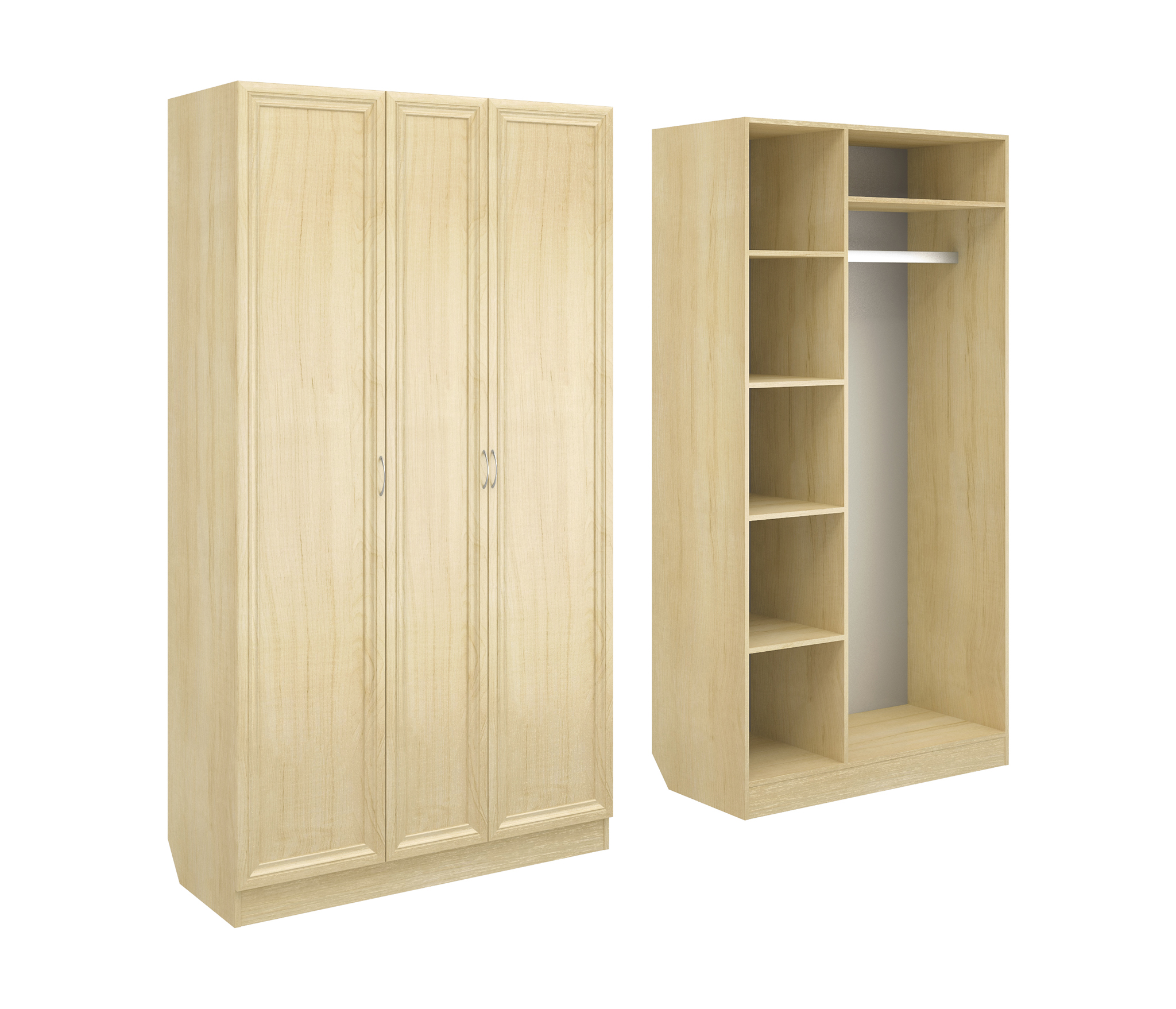 Корпус шкафа выполнен из Ламинированной ДСП высокого качества с насыщенным цветом. Фасады выполнены из материала МДФ.Ширина шкафа 90 см., большая и функциональная трёхстворчатая модель. В левой секции ниши для сложенных вещей. Справа штанга для одежды.