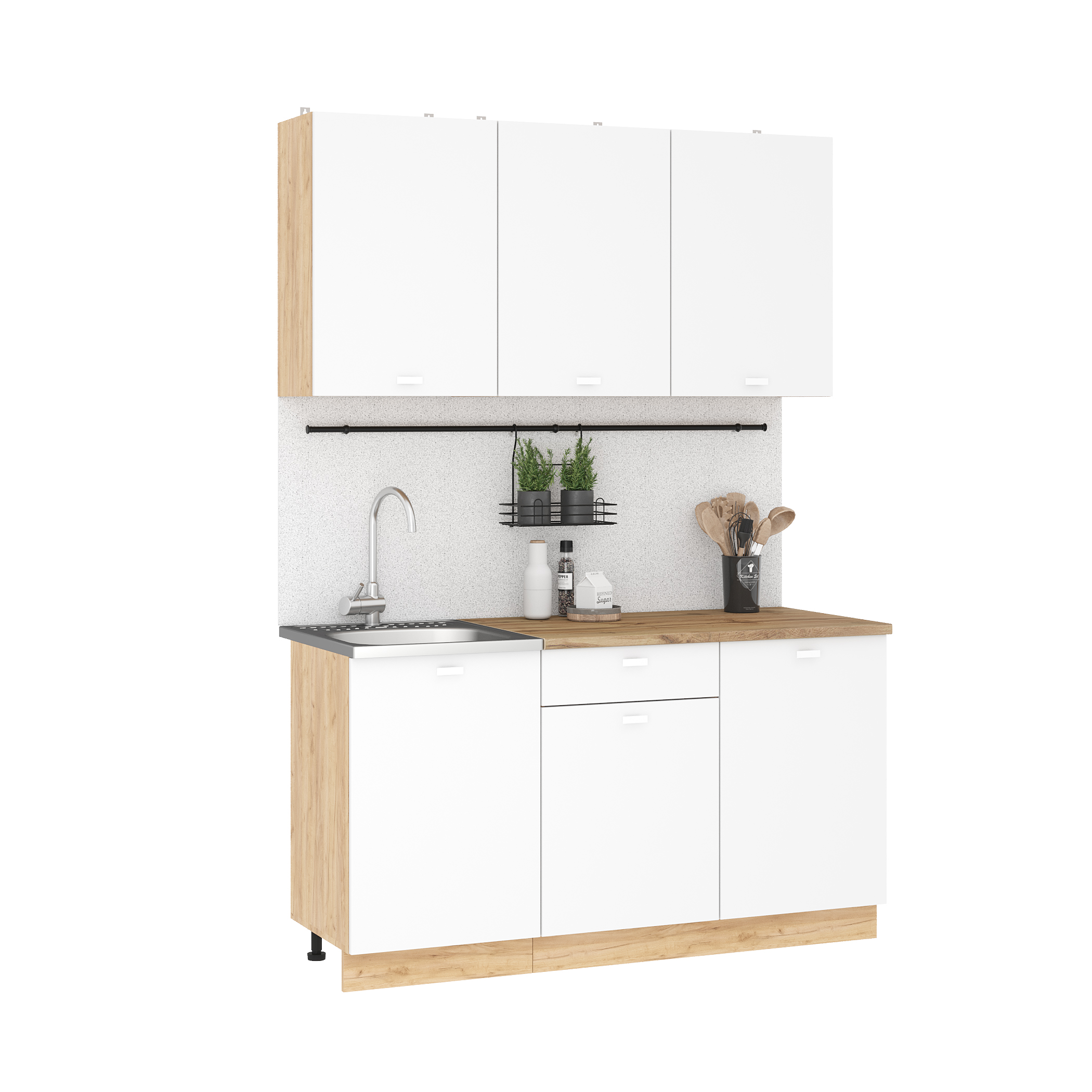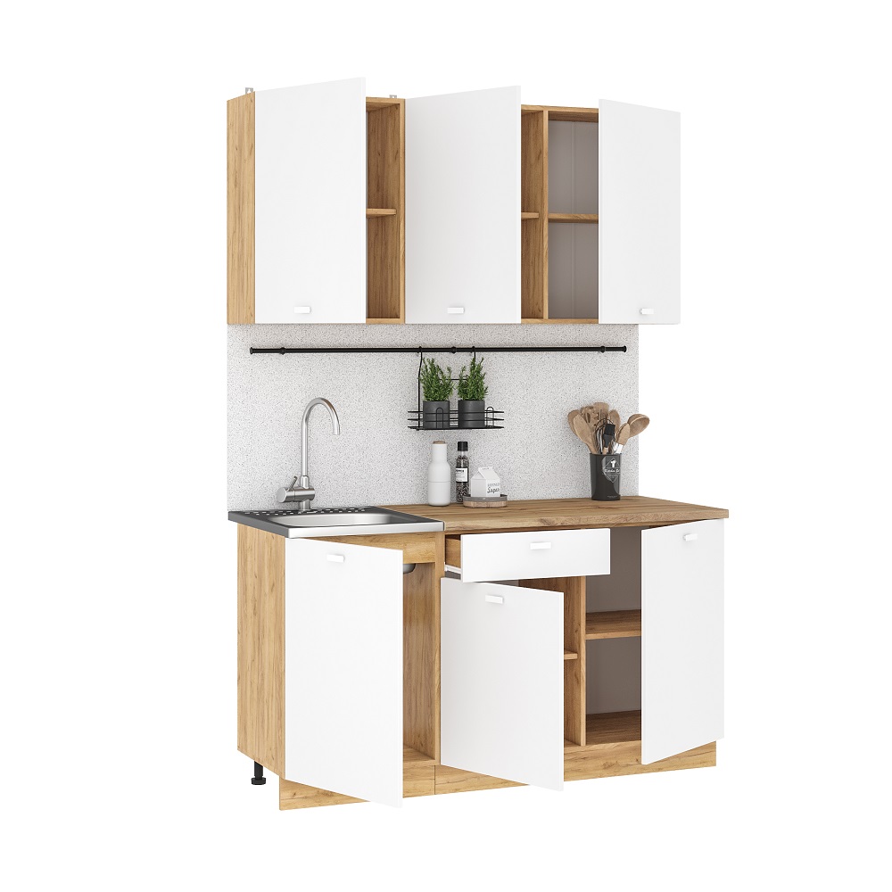 Дана – универсальный гарнитур для компактных кухонь и квартир-студий. Верхние модули: ШВ 500, ШВ 1000 - (ВхГ) 71.5х30 см. Нижние модули: ШНМ 500, ШН1Я 1000 - (ВхГ) 84.1х47 см (высота указана с учётом столешницы). Декор столешницы – Дуб вотан 26 мм.