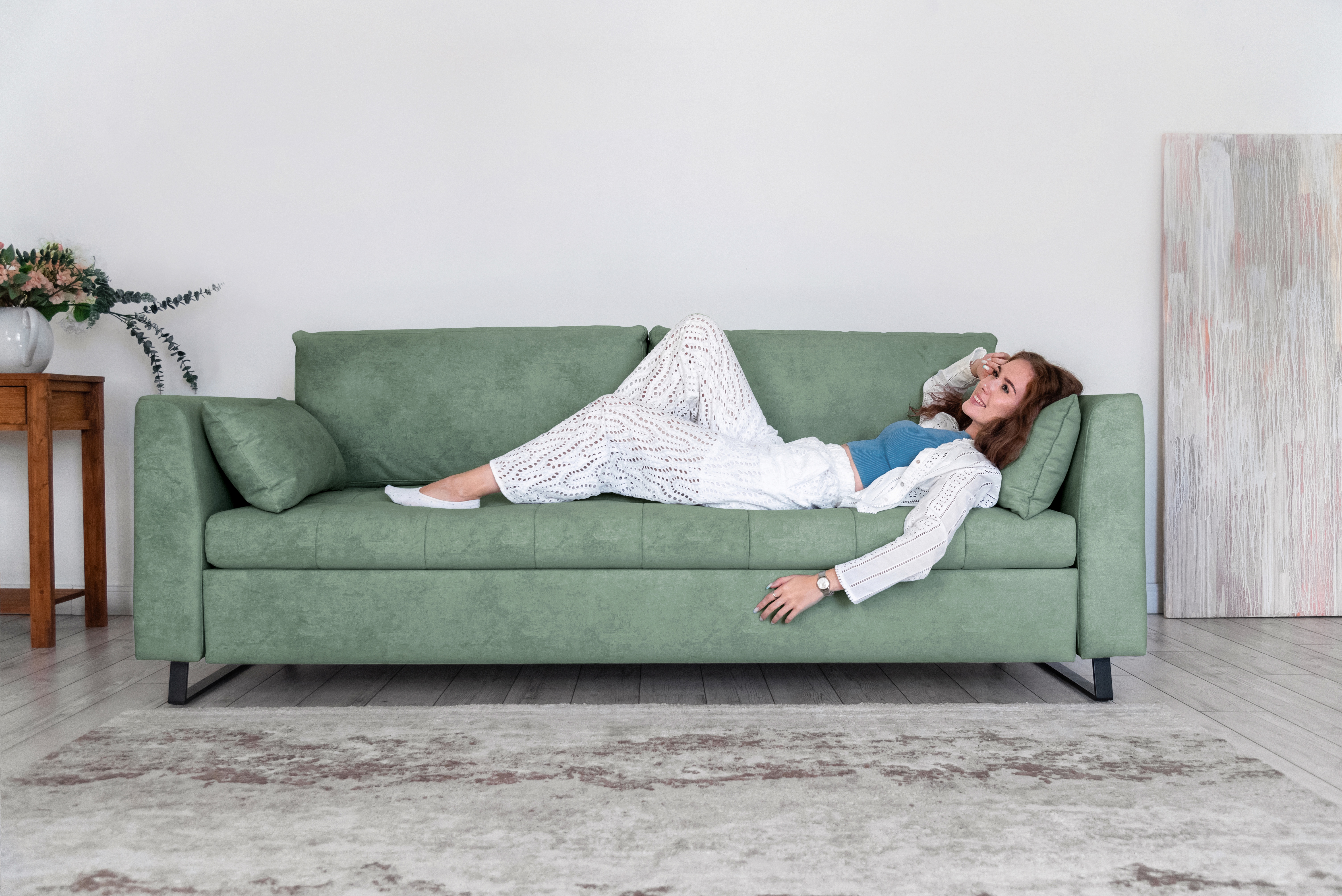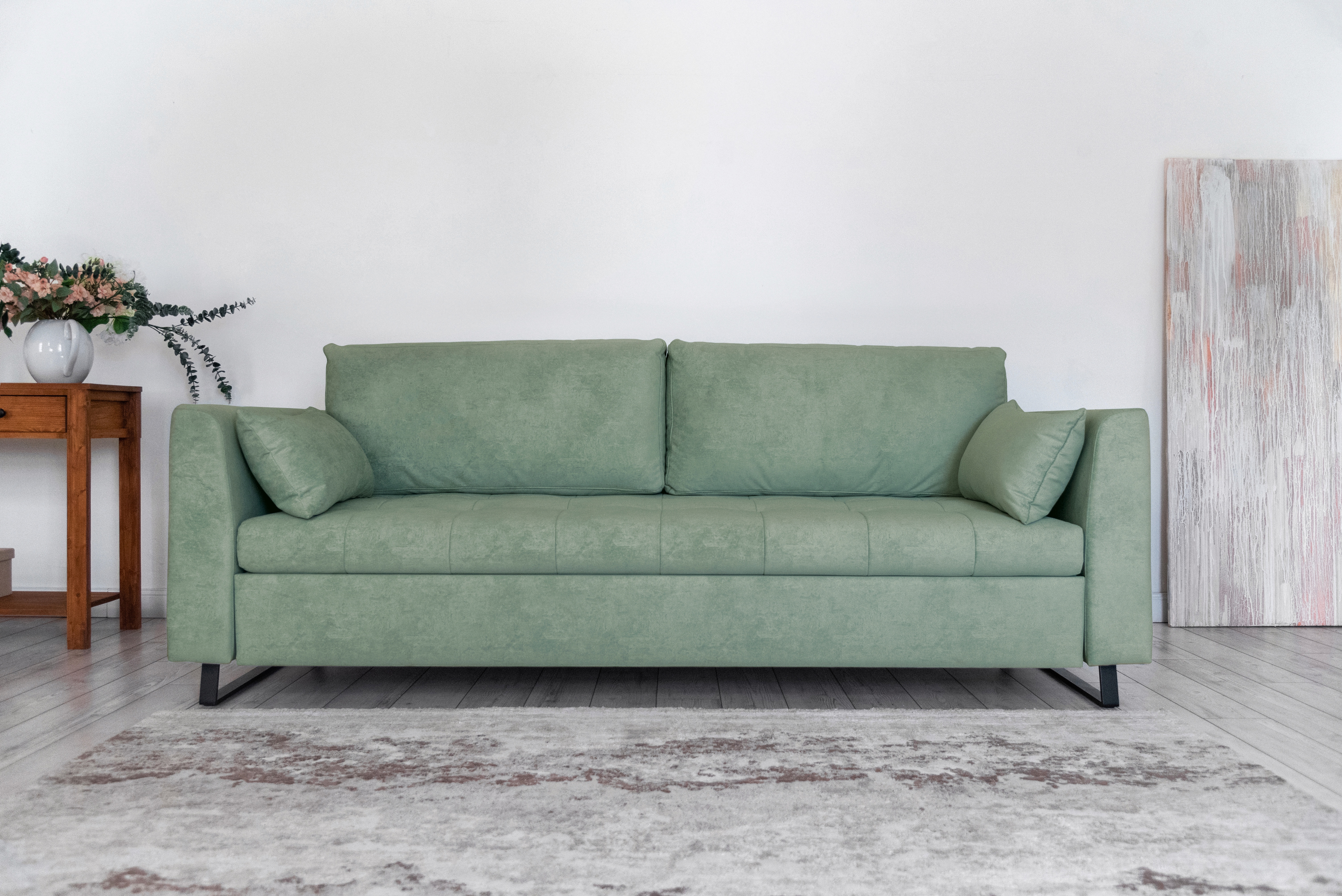 Механизм трансформации — шагающий (пантограф). Что позволяет использовать этот диван вместе с высокими коврами, и значительно упрощает раскладывание.