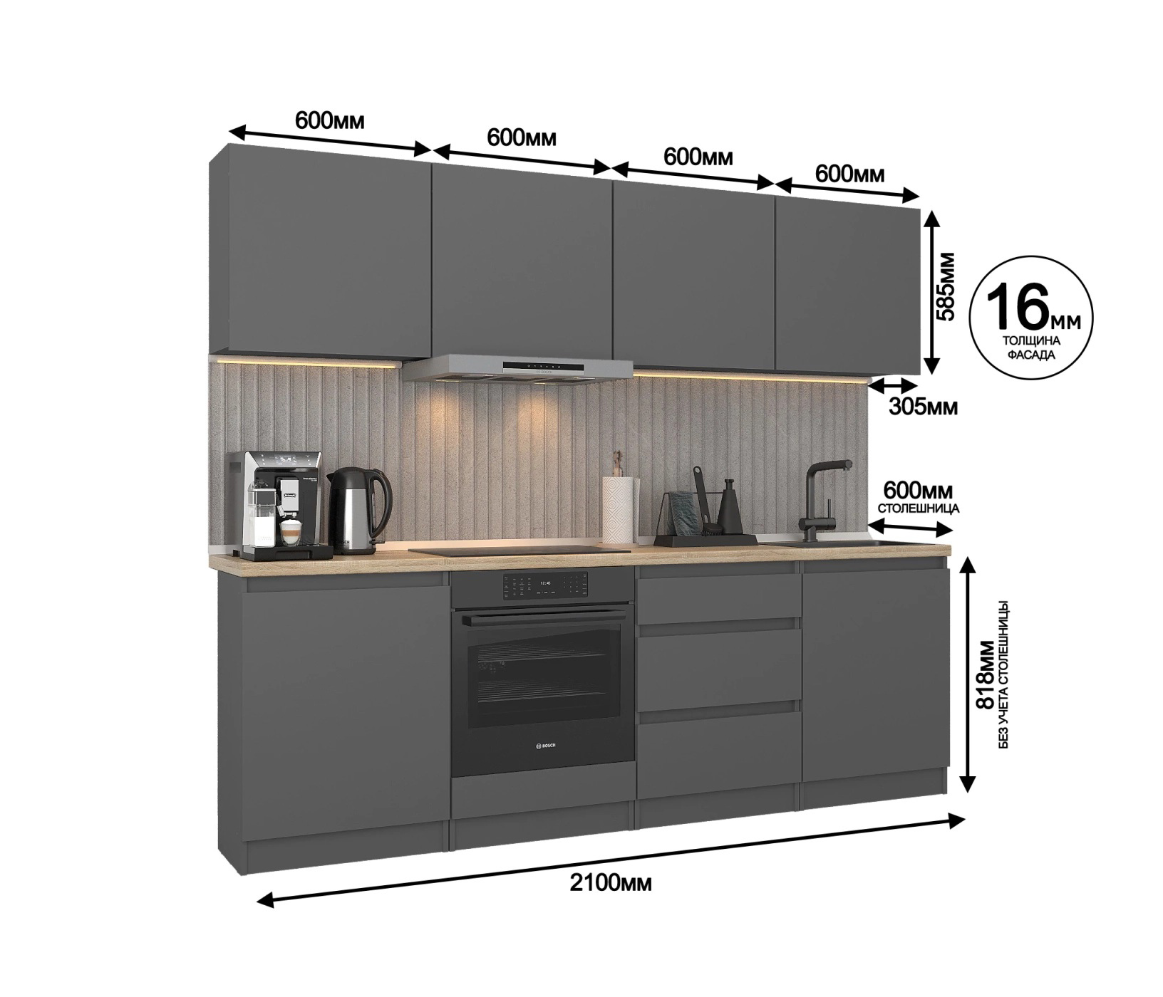 Обратите внимание, что столешница, стеновая панель, мойка и смеситель не входят в комплектацию кухни Леон и приобретаются отдельно. Это позволяет вам выбрать идеальные аксессуары и элементы для создания индивидуального дизайна вашей кухни.