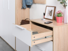 Комод Куба 13.113 выполнен в лаконичном, минималистичном дизайне, в сочетании белых фасадов и корпуса цвета "дуб сонома", оснащен двумя выдвижными ящиками и двухрядным кассетным отделением с откидывающейся дверкой. Дополняют стильный образ неброские металлические ручки белого цвета и серые пластиковые опоры.