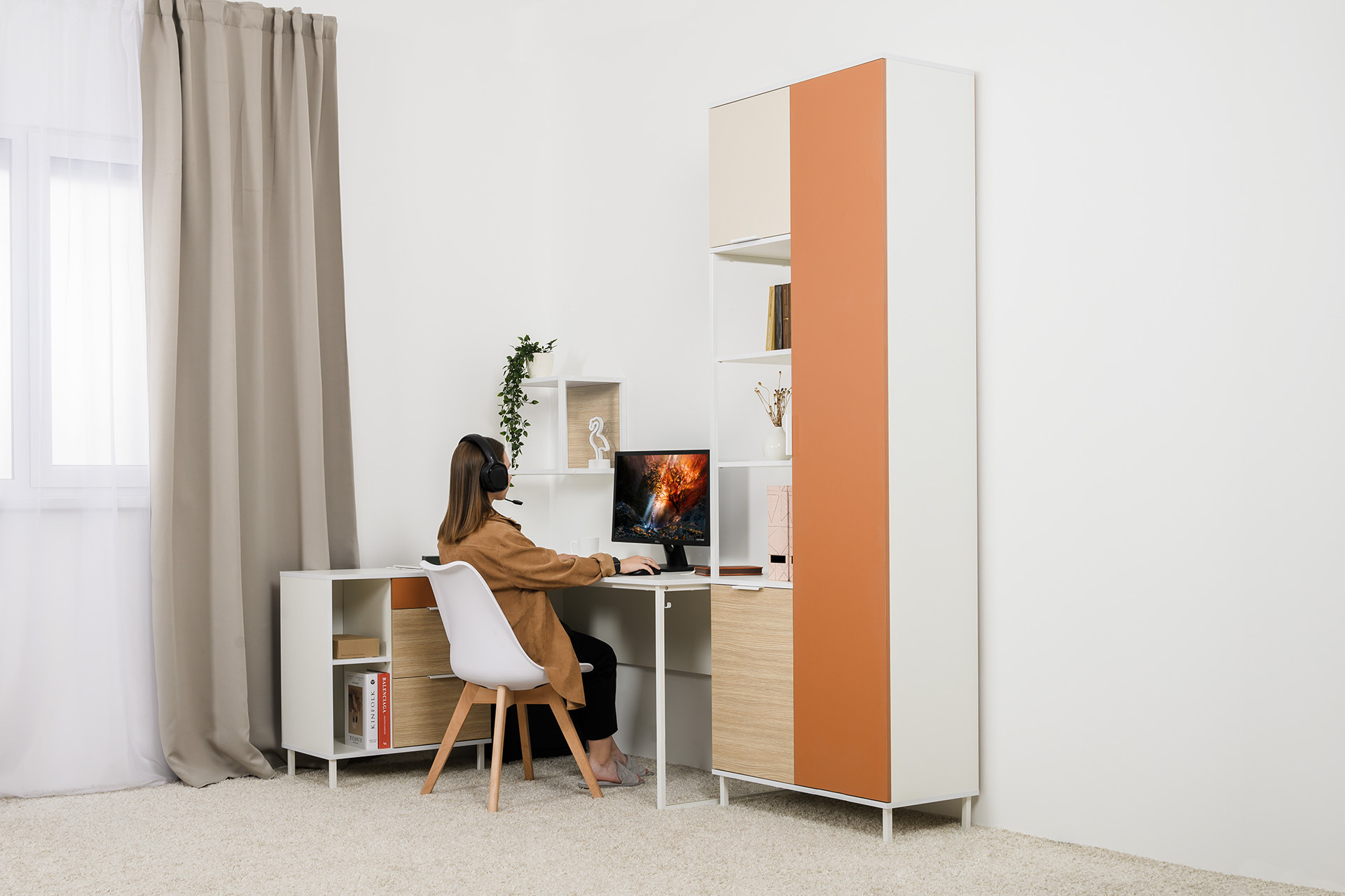 Столешница и одна из опор ЛДСП, каркас стола металлический. Изделие установлено на пластиковые регулируемые подпятники.