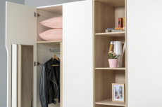 Наполнение шкафа может собрано на любую сторону, два выдвижных ящика скрыты за распашными фасадами, на обратной стороне которых размещается зеркало.