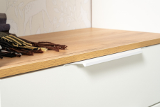 Аккуратная обувница с выдвижным ящиком для мелочей сверху и нишей с откидной дверкой с полками для обуви снизу. Отделение с откидной дверкой с полками вмещает до 6 пар невысокой обуви. Шариковые направляющие полного выдвижения обеспечивают тихую эксплуатацию выдвижного ящика. Металлические ручки выполнены из алюминиевого профиля надежно крепятся и удобно ложатся в руку. Визуально может показаться, что мебель без ручек. Такая видимость создается из-за того, что профиль крепится к торцовой части дверей и ящика. Тумба для обуви оснащена пластиковыми опорами серого цвета.