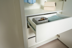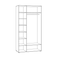 Внутри гардеробная полка, штанга для плечиков и три выдвижных ящика для хранения мелких предметов.