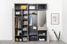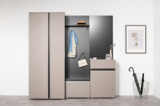 Сидней – стильная и функциональная прихожая, которая масштабируется под любую площадь помещения и высоту потолков. Минималистичные фасады в трендовом цвете без лицевой фурнитуры открываются за край либо нажатием (push-to-open). Большой выбор модулей: высота шкафов от 2050 до 2400 мм и полноразмерная глубина позволит максимально использовать полезное пространство. Вместительная система для хранения одежды, обуви и хозяйственных принадлежностей. Цветовое решение: ЛМДФ 16 мм Веллюто Капучино; ЛДСП 16 мм Антрацит.