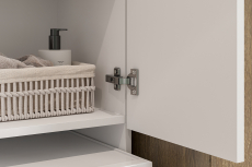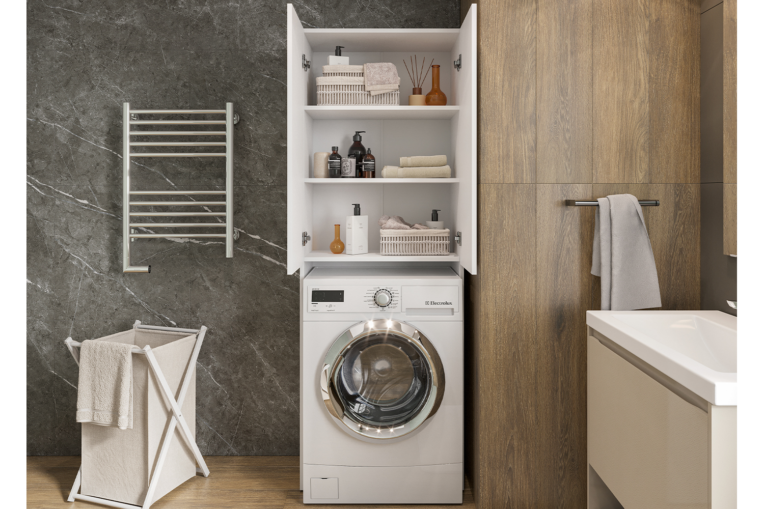 Пенал имеет две дверцы и одну нишу для стиральной машины, обеспечивая удобство использования и хранения вещей. Петли с механизмом плавного закрытия гарантируют надёжность и долговечность изделия.
